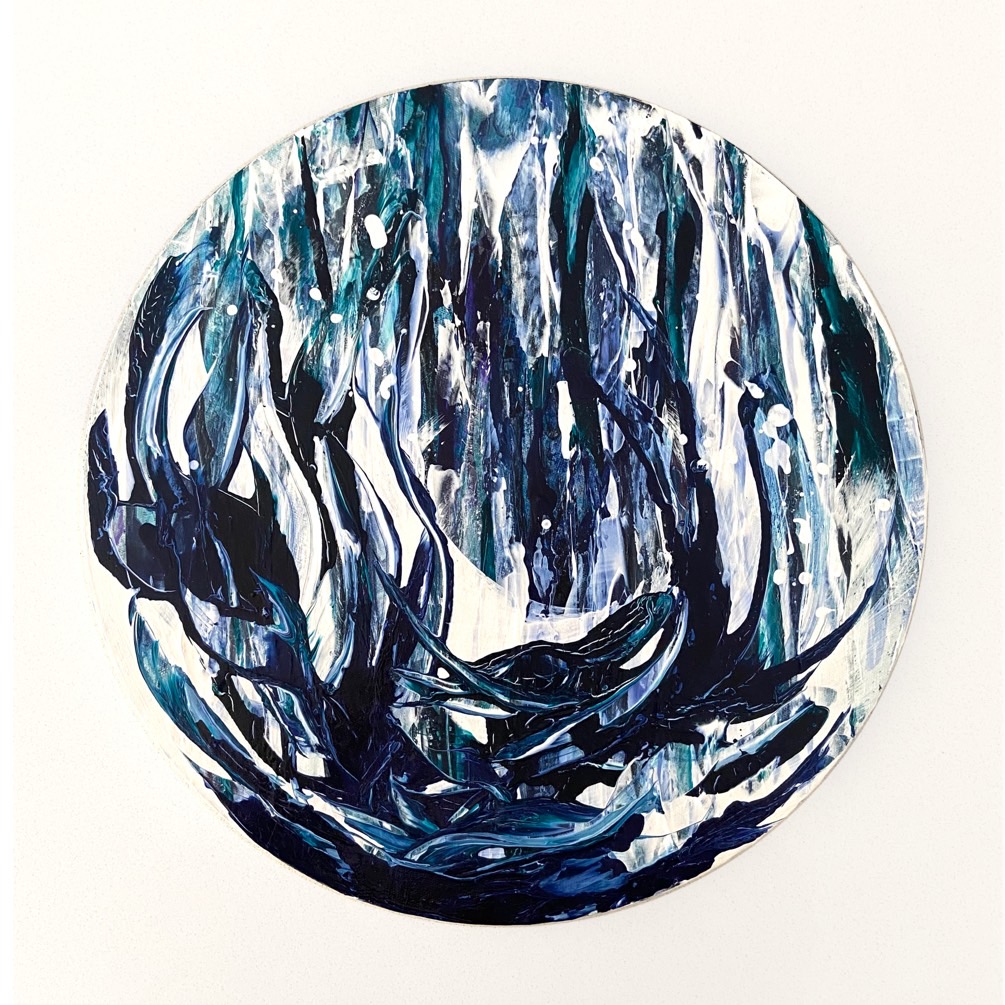 Oceans by Carrie Welsh is a striking abstract circular piece with beautiful deep colours and captured movement. This will brighten up any space! 40.5 x 40.5 cm. Acrylic on canvas, ready to hang.