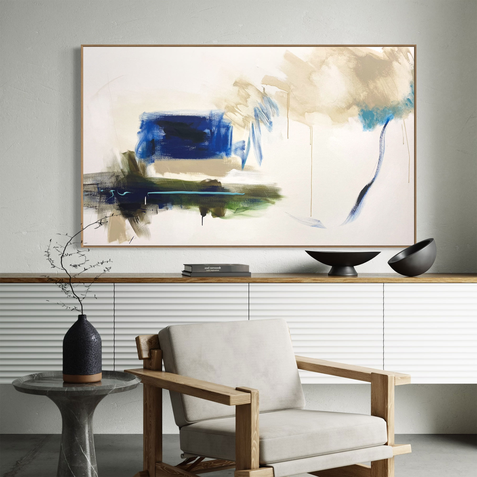 ‘Oceanside’ is an energetic fusion of acrylic and pencil captures raw emotion in each stroke. The abstract expressionism style pulses with life around the water through its bold contrasts in dark and bright blues, olive and green, beige and white.