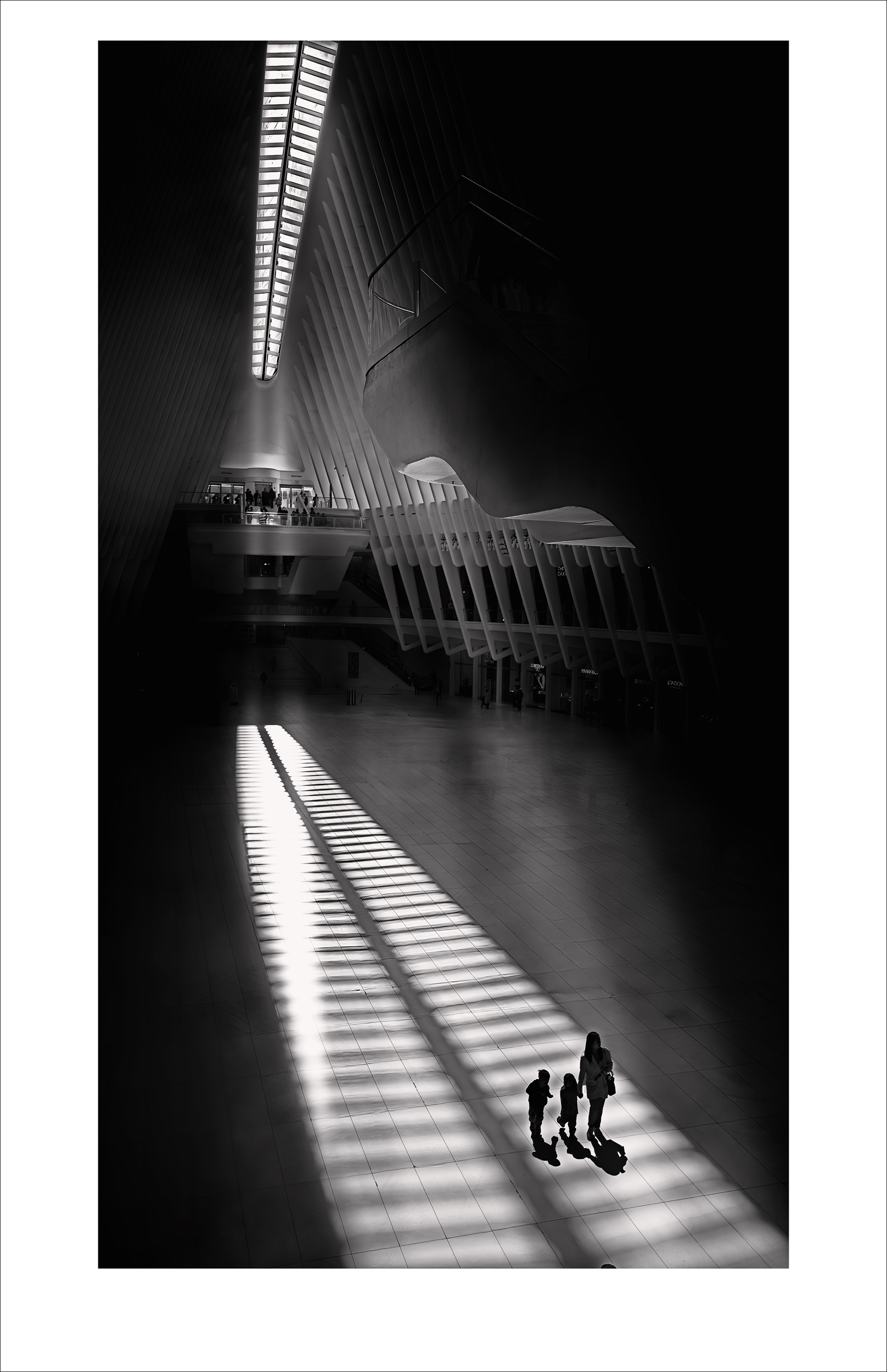 A high-contrast, black and white photograph capturing a moment within the World Trade Center Transportation Hub (The Oculus) in New York City. The composition is dominated by a sharply defined, rectilinear beam of sunlight that cuts through the massive, dark interior space, emphasizing the dramatic architectural structure designed by Santiago Calatrava. Three small figures—a woman and two children—are positioned in the lower right, walking along the illuminated path, their small scale highlighting the immense size of the terminal and creating a sense of isolation and journey. The strong shadows and geometric patterns give the image a graphic, abstract quality, juxtaposing the monumental architecture with the intimacy of the human subjects.