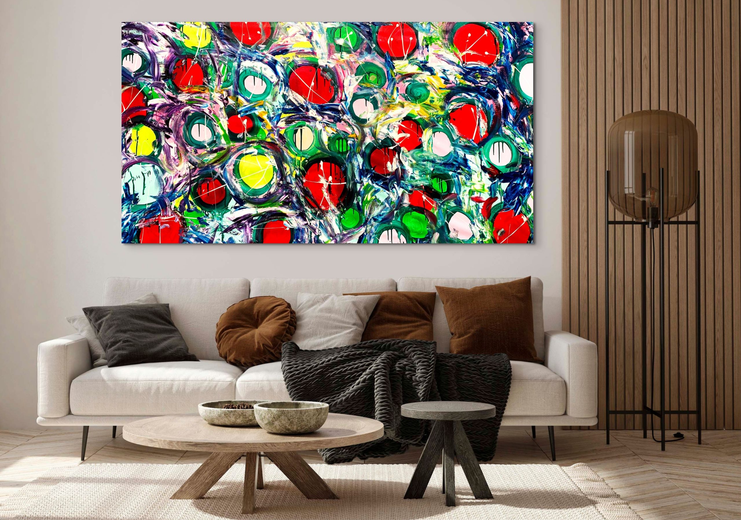 This artwork is painted on professional-grade canvas stretched and sealed with varnish. The canvas has dimensions 197 cm in width by 106 cm in height. The painting is painted on the sides in a different colour.
