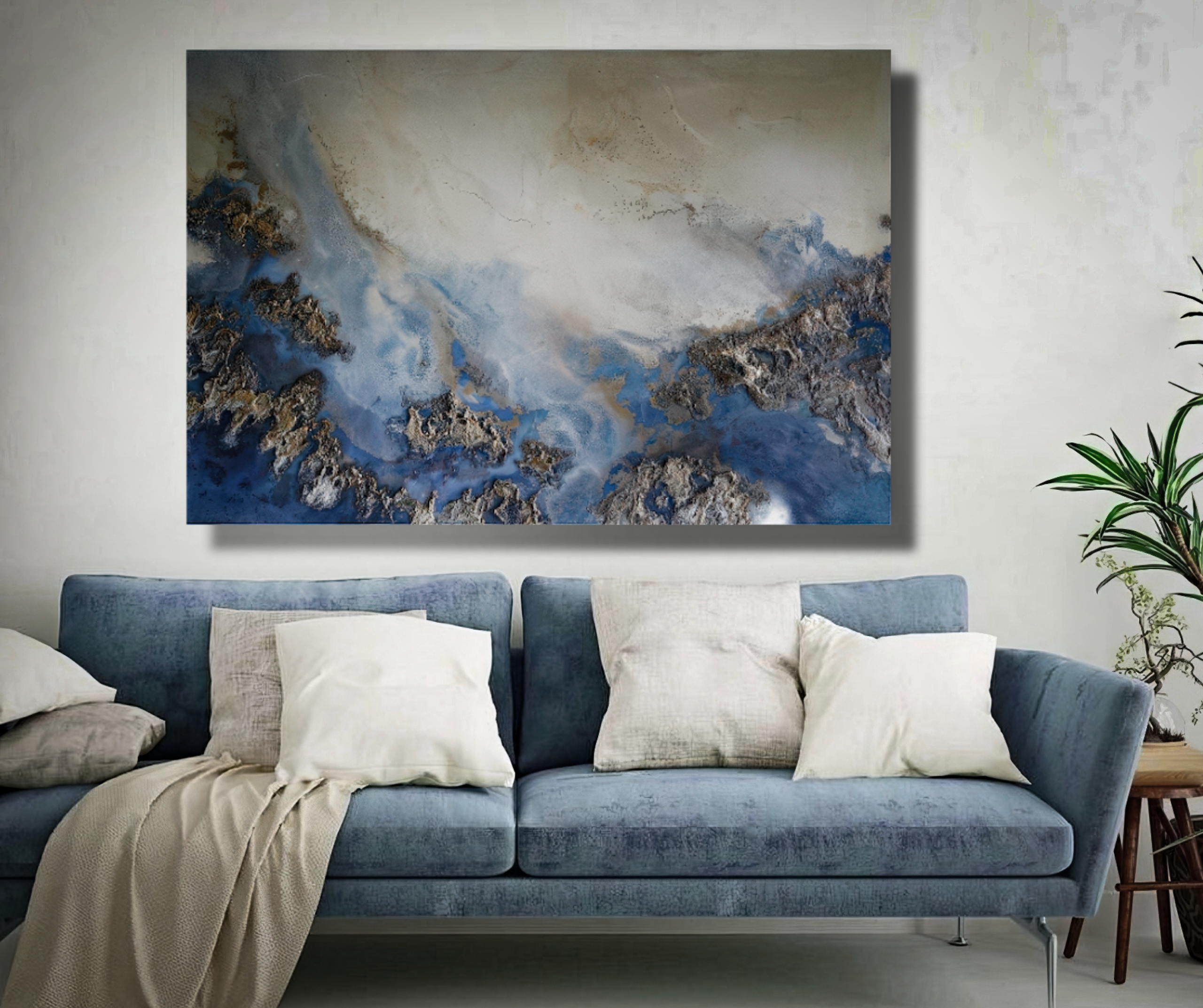 This work represents the effects of reactions between mixed mediums. The power of the chemistry between these pigments carried by different mediums, attracting or repelling each other resulting in ocean and reef like formations. In addition to paint brushes, I use my hands, air guns, rods, blow torch, and gravity. Typically working in large formats, I “sculpt” my paintings, starting with a board upon which I layer various materials. Inspired by the waters of the Great Barrier Reef, very close to where I am lucky enough to live.