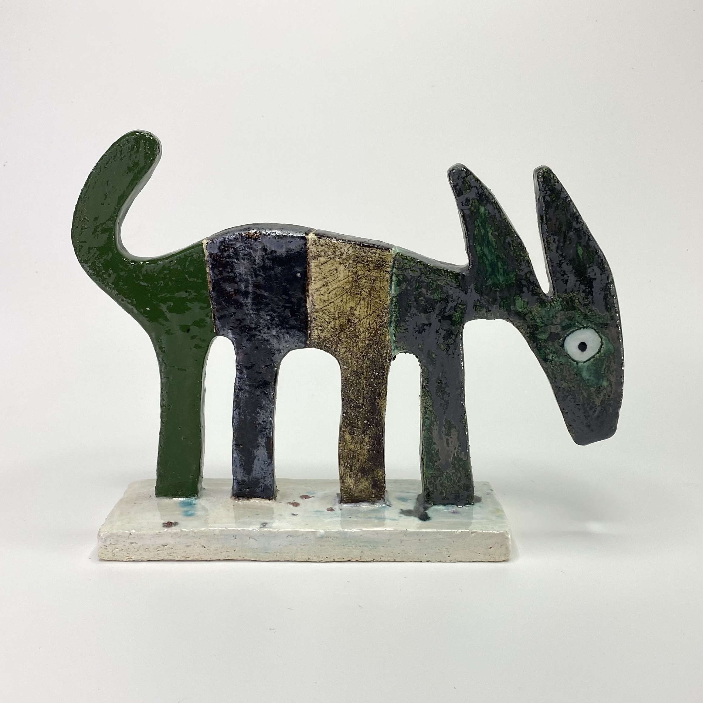 Moody goat glazed with four different oxides.