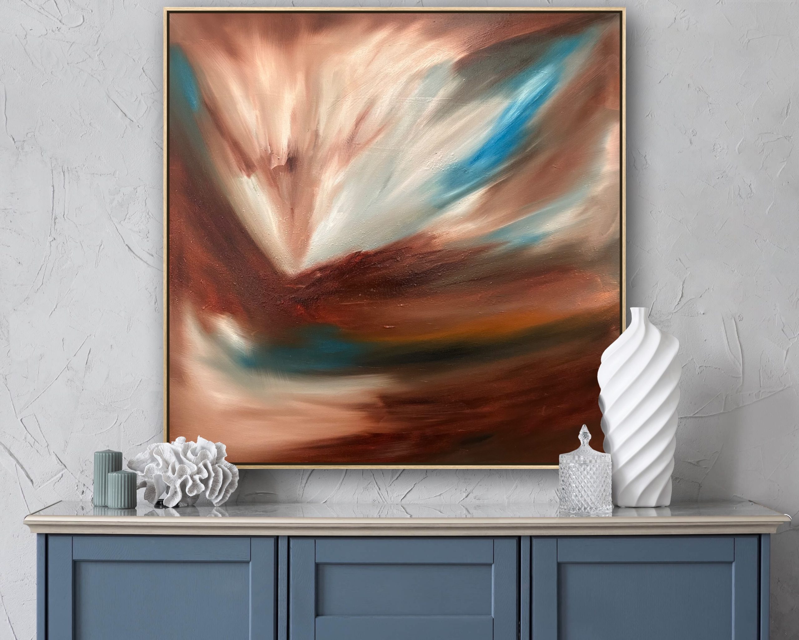 This abstract oil painting marks the first of Alanah’s abstract collection celebrating movement and the release of colour. The edges have been painted to create a faux frame and if a frame is chosen, no exposed canvas will be seen.