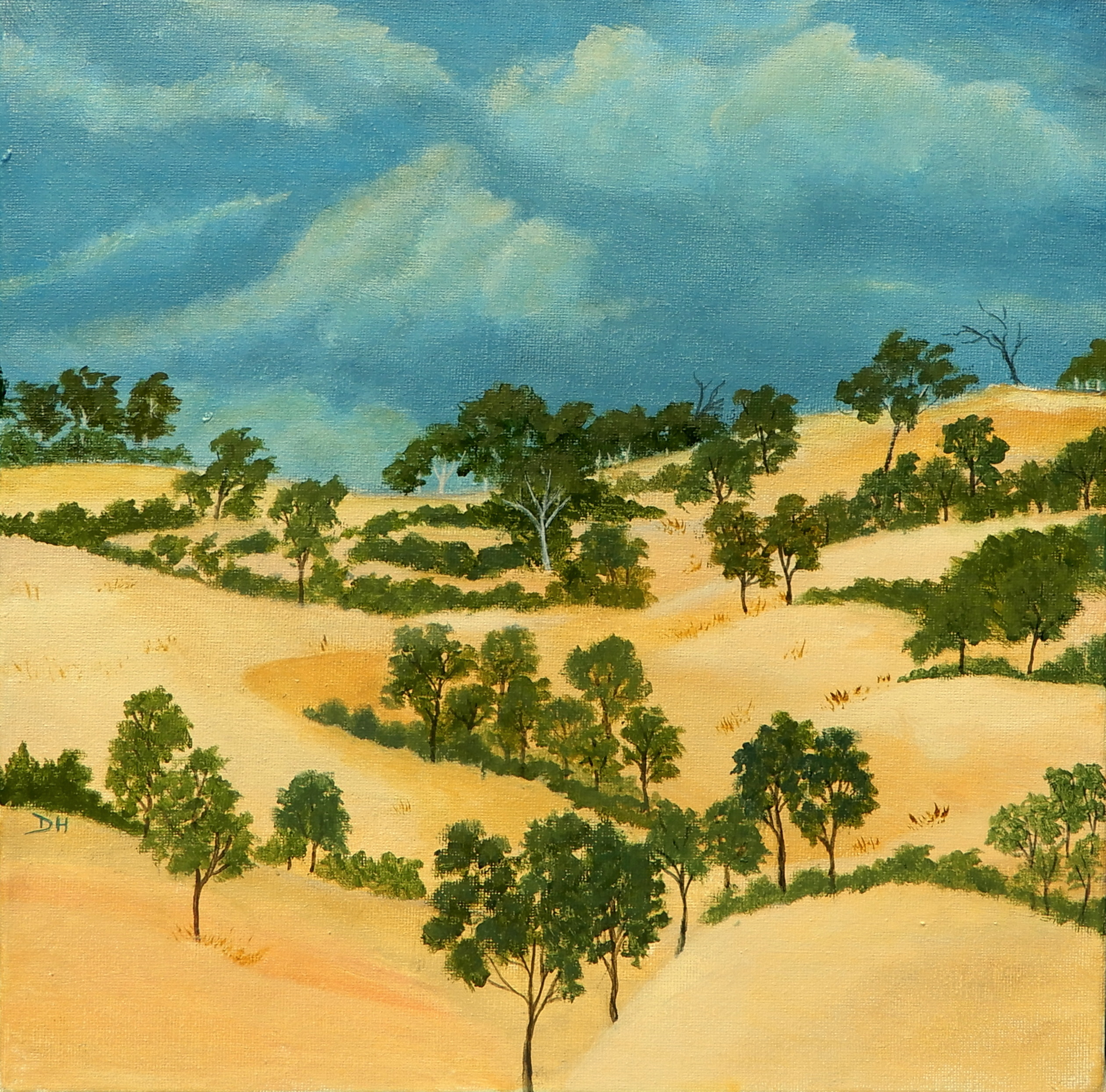I took a photo from the car on the highway near Goulburn, golden light spilling over hills as thunder clouds fill the sky.