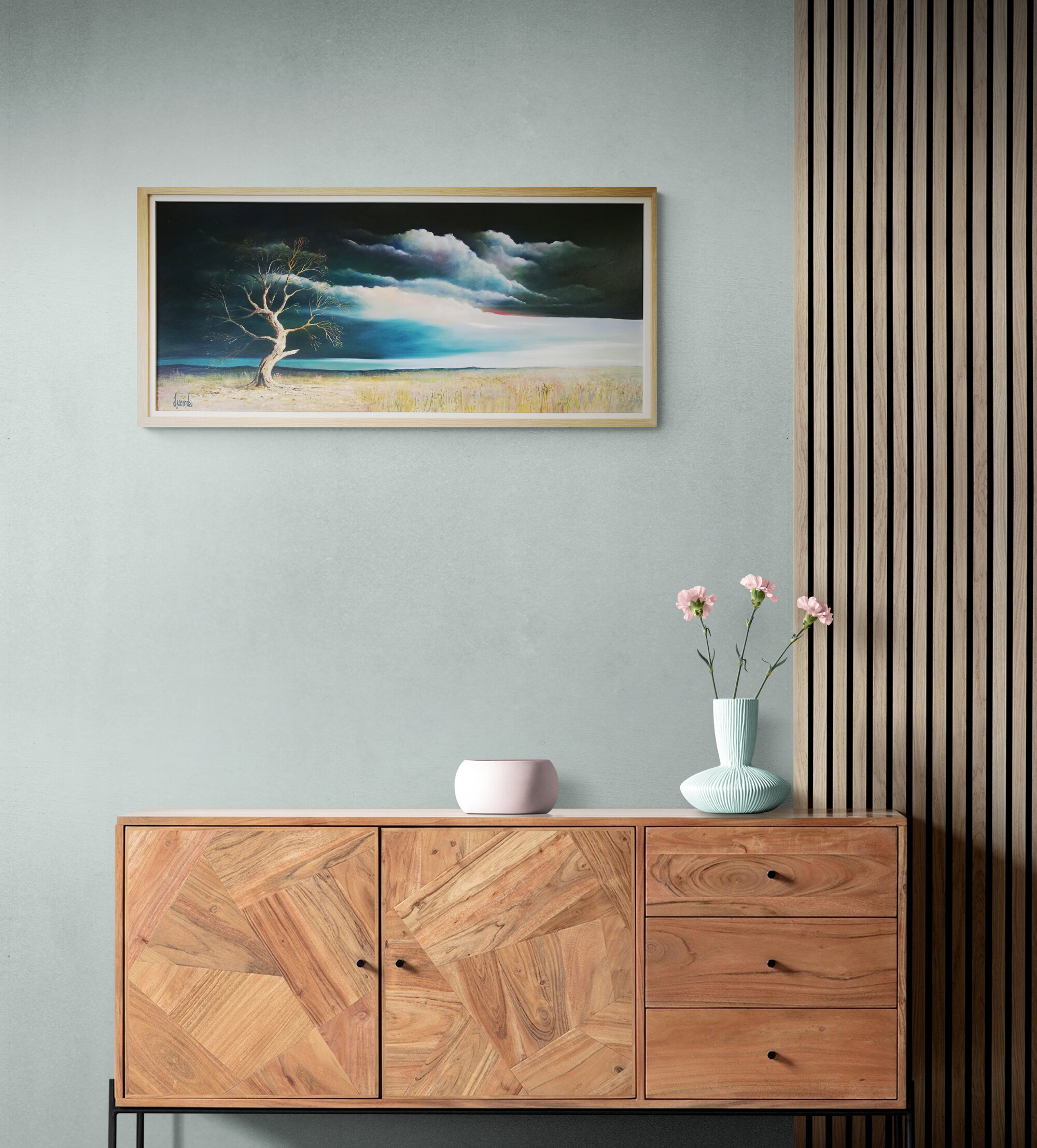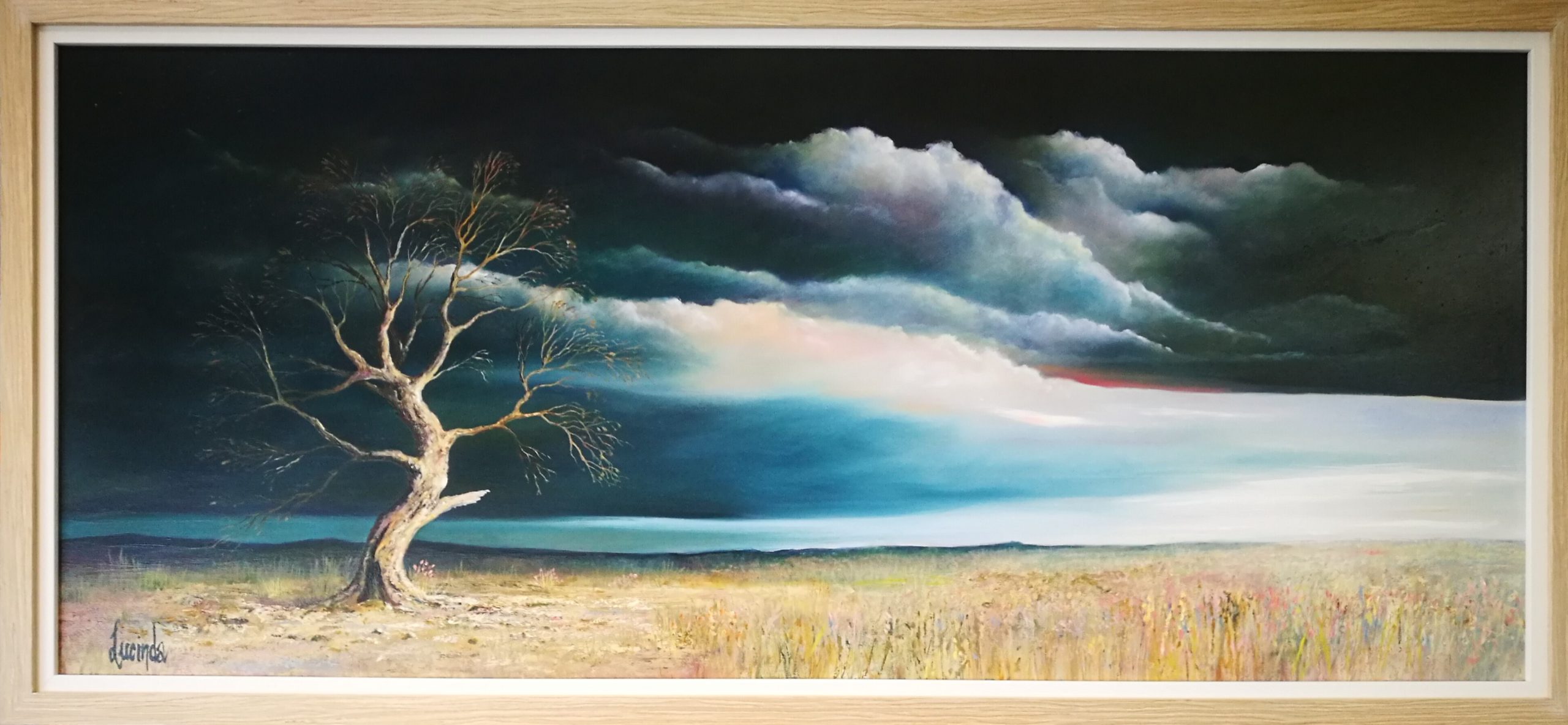 The exploration of single images in the landscape has taken over my work at the moment but I love trees and I love clouds, both are my absolute favourites to paint. I don’t really care if its watercolour, oil paint, graphite or anything really. Between those two and trying to capture the light, I am always in art heaven. I hope you enjoy this piece, I find it particularly peaceful and its a place I can go to contemplate the world. The painting is framed already with a white insert and oak frame, which mimics the colours of the piece.