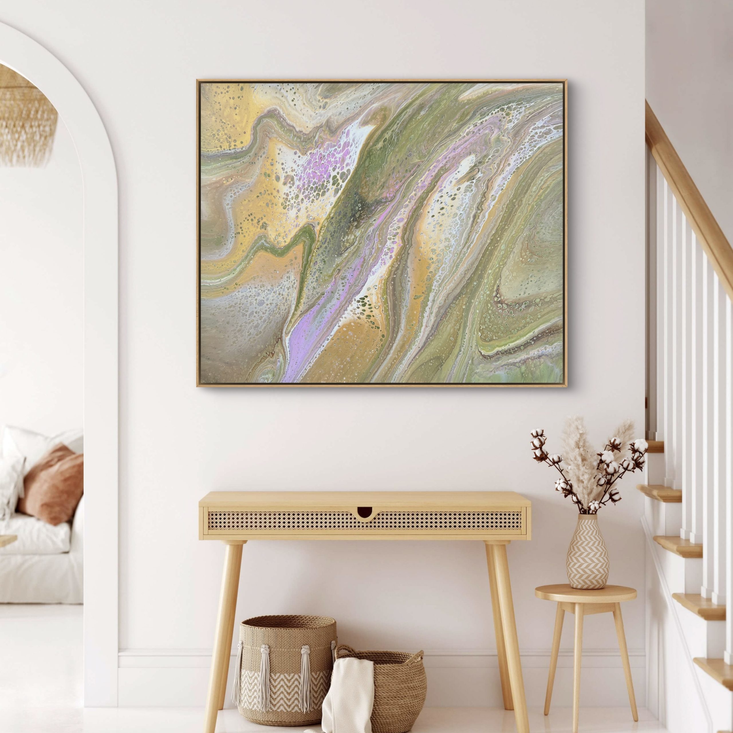 This beautiful piece is 120cm x 100cm and features olive green, blushing pink, cream, gold, umber, black and white acrylics. I will sign the bottom left corner once the orientation is confirmed as this painting can be hung multiple ways.