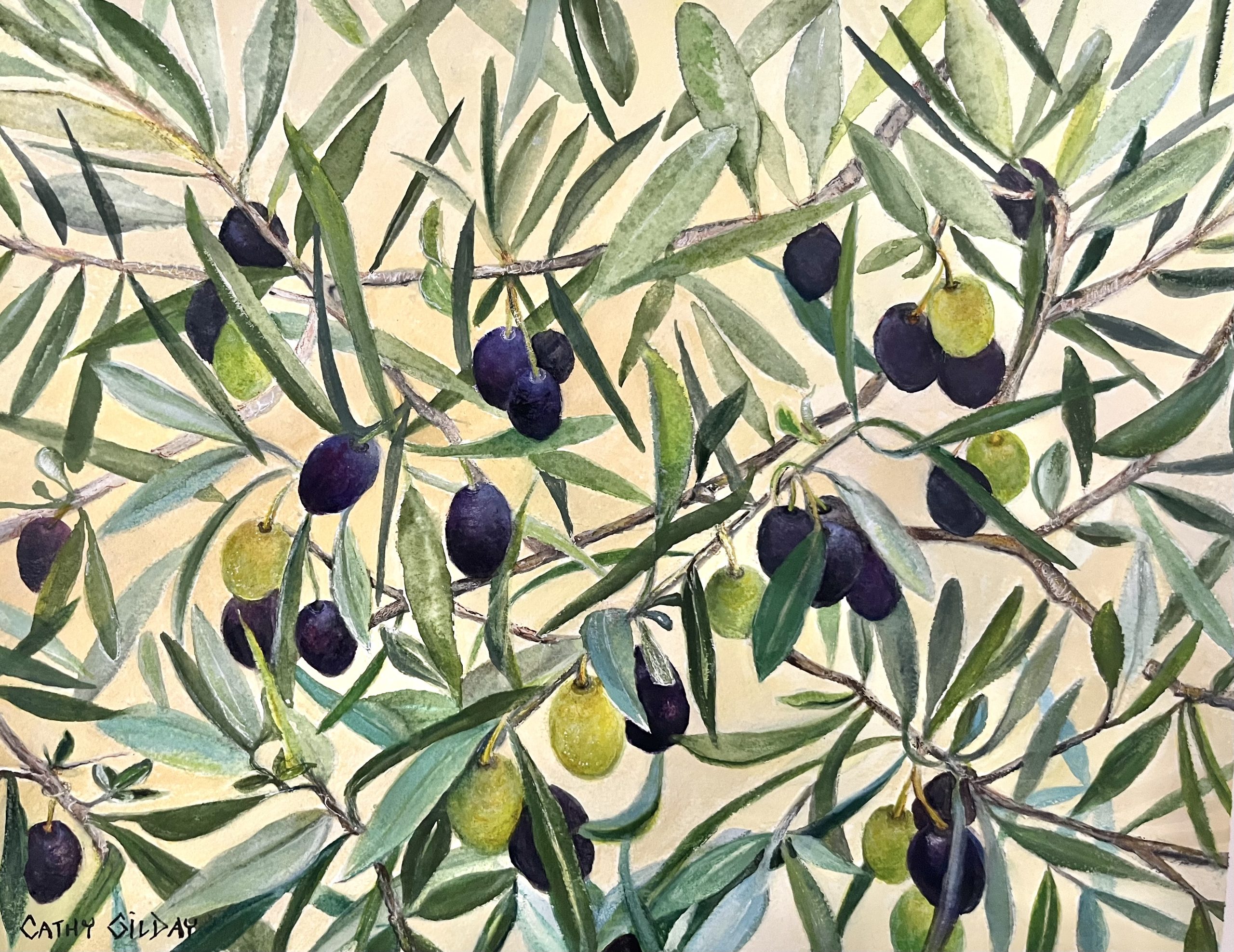 Olive Green by Cathy Gilday Coming from an Italian background, I can always remember having large jars of olives in the pantry , lovingly preserved by my mum. This elegant botanical study of olives hanging from leafy branches, is a celebration of the fruit and the fond memories they conjure. I think it would make a lovely addition to a kitchen or formal dining area. Requires framing.