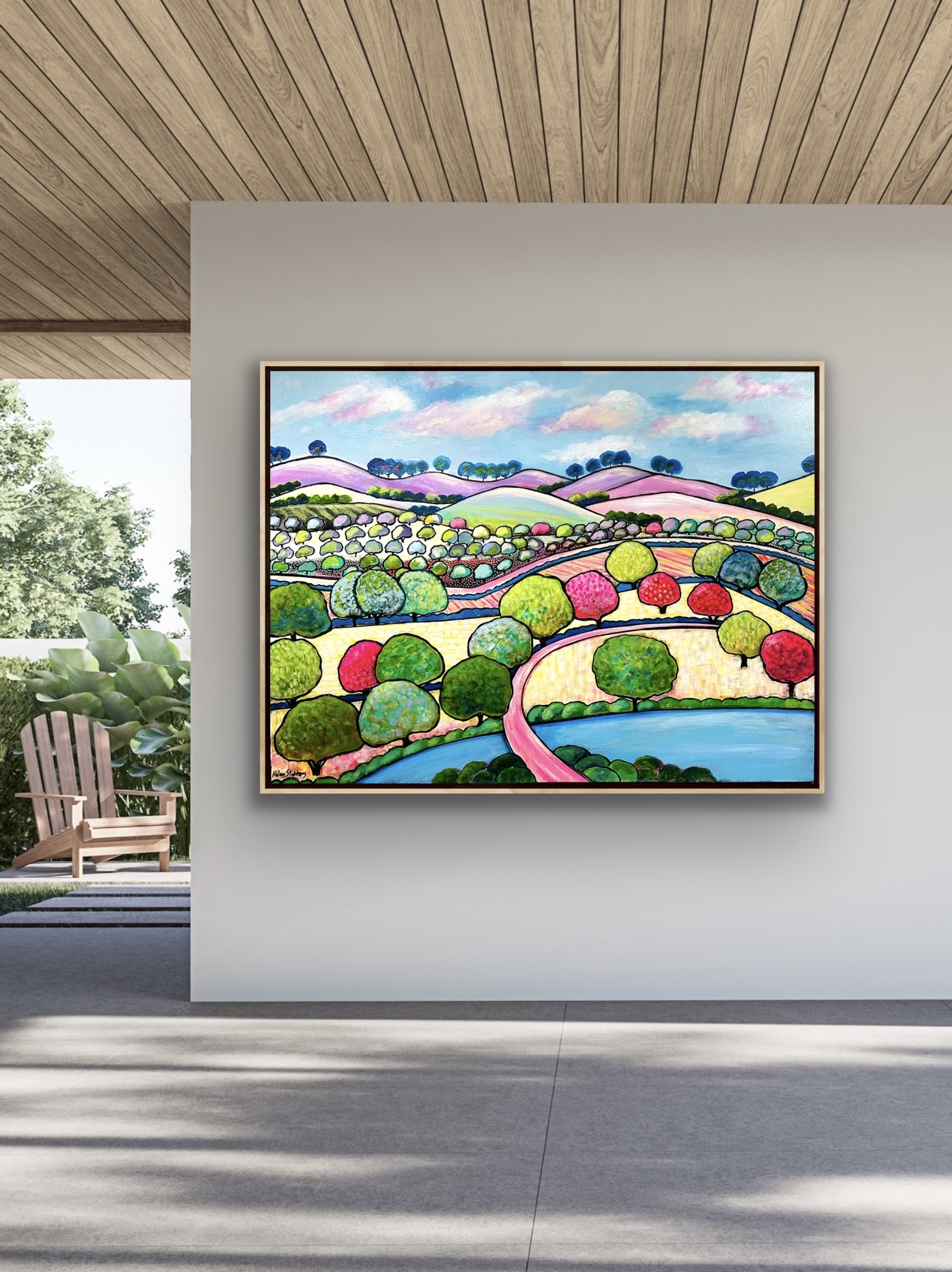 Inspired by the beautiful olive groves and scenery that stretches to the Great Dividing Range, just outside of Brisbane. Colourful, original, reinterpreted with brush strokes and stylised intent to create a one off Australian modern landscape like no other.