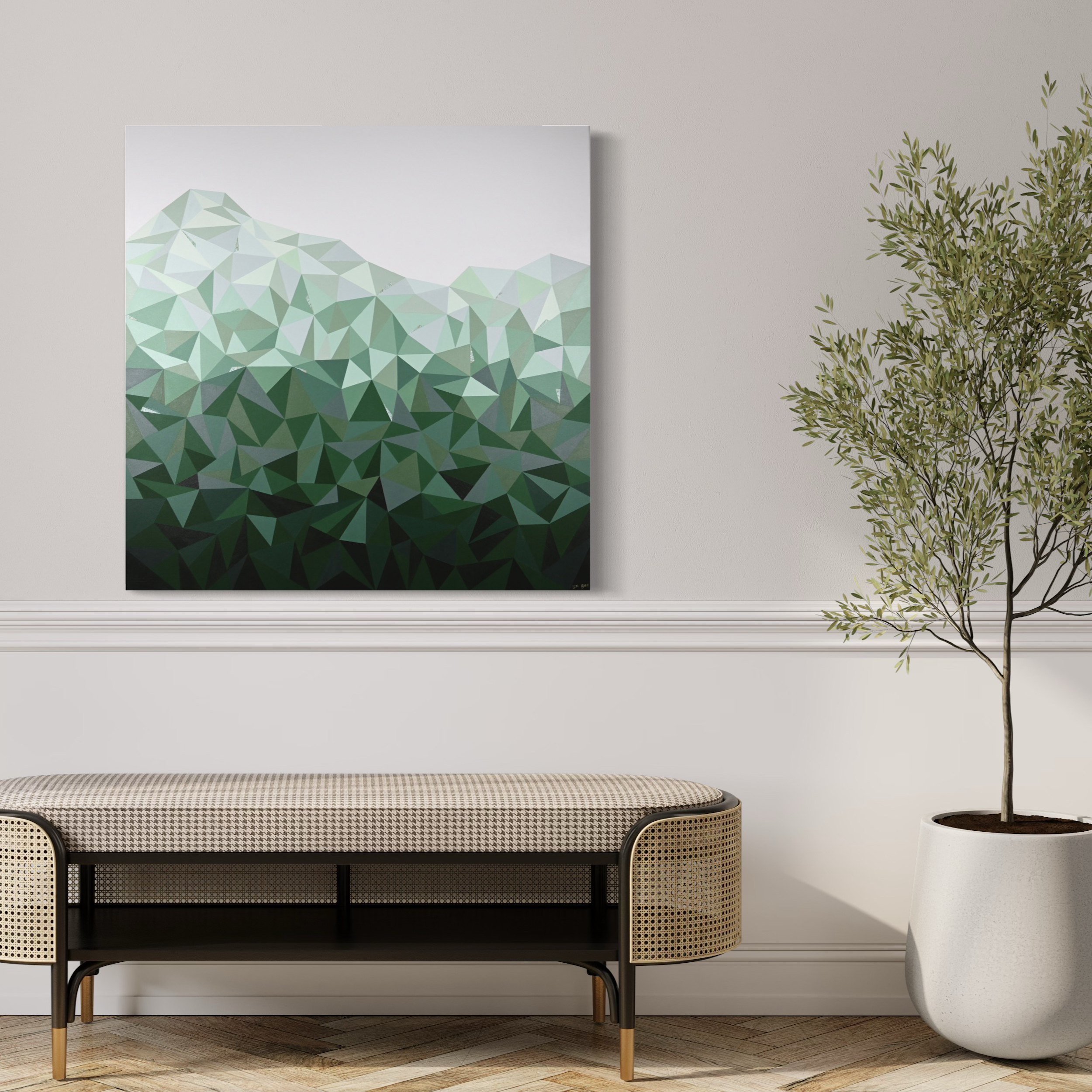 Olive Grove by Liz Bell – This original artwork uses shades and variants of olive and green to create reflections of light, depicting the morning or evening sunlight filtering through the trees. Origami paper in green/white/gold has been used to add subtle highlights to the geometric patterns, adding interest and gentle beauty to the gradient of greens as they climb the canvas.