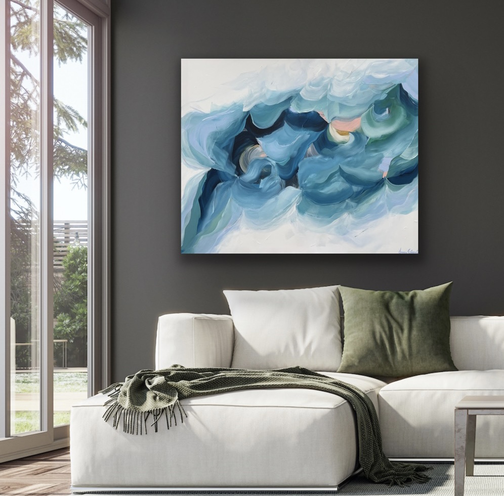 A striking addition to any space. The brushstrokes are bold and expressive, with some areas appearing smooth and others more textured. The overall effect of this piece is both calming and energising, evoking feelings of tranquility and vitality at the same time. A piece that adds a positive light to any room.