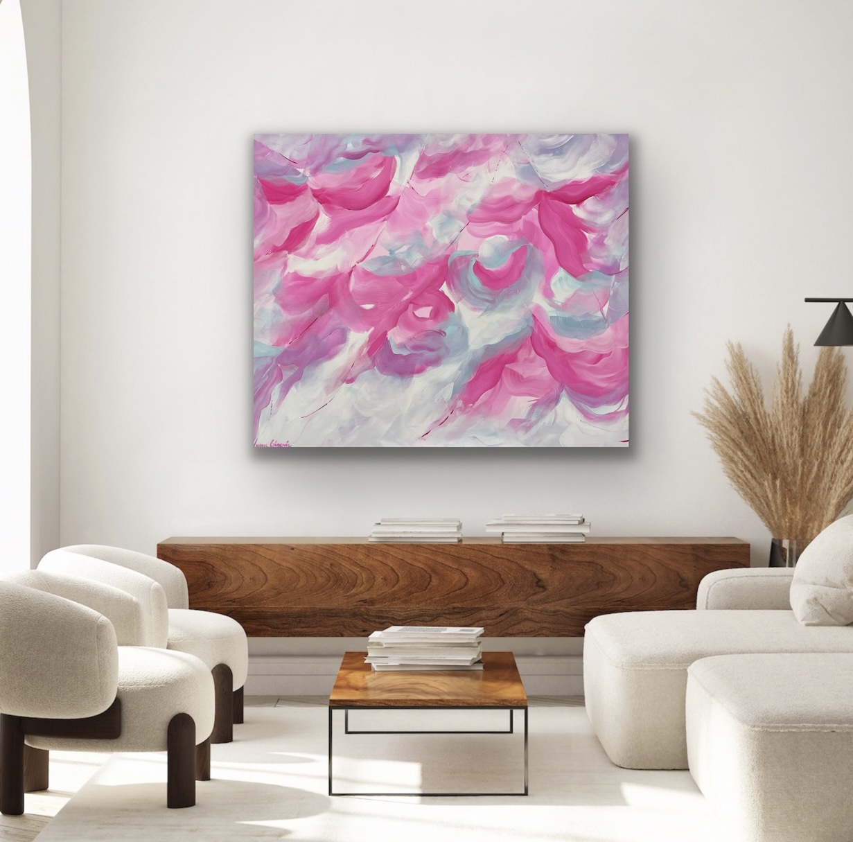 This stunning abstract painting serves as a delicate dance between shades of floral pink and serene light blue, encapsulating the essence of nature’s beauty and the playfulness of imagination. A floral abstract adaptation creating a vibrant yet serene state.