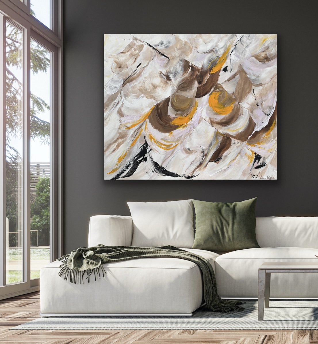 ‘On A Journey No 21’ is a captivating abstract artwork that incorporates shades of black, brown and grey into a statement artwork. Vibrant pops of yellow and earthy brown tones bring warmth and grounding to the overall piece.