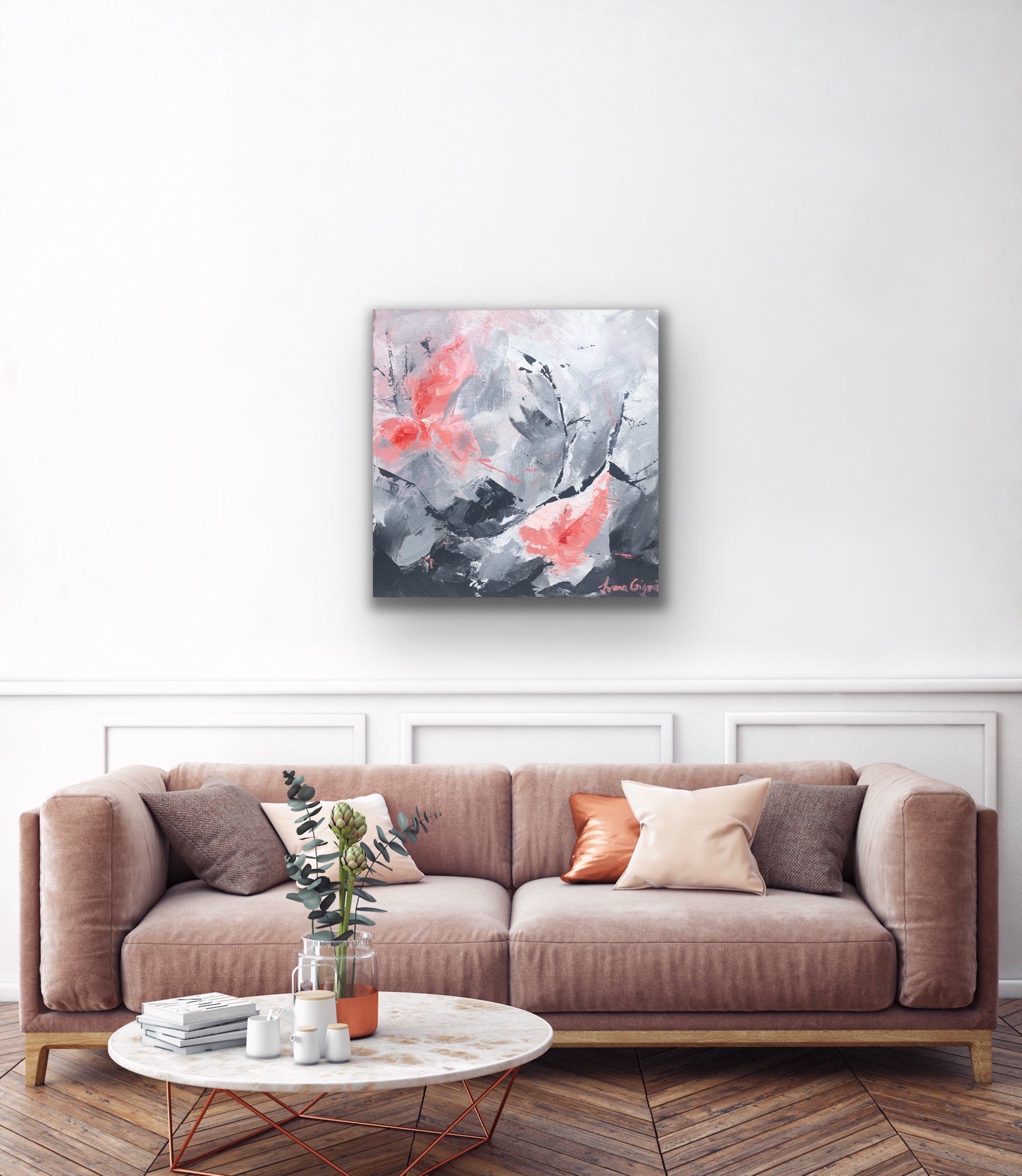 This painting is number 5 in my ‘On A Journey’ series. I wanted to keep this one simple, modern and fresh. I wanted to let the different shades of coral/pink and grey create a statement piece on any wall.