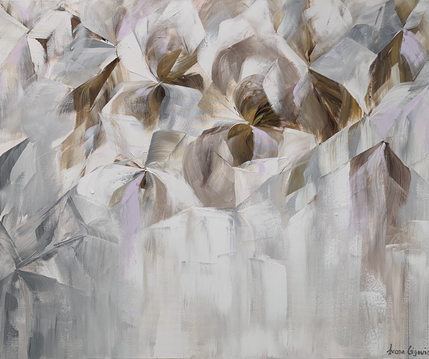 Shades of grey and soft brown give this artwork dimension and depth. A touch of lilac adds light and freshness. A lovely modern piece that will add a sense of calm and joy to any room.