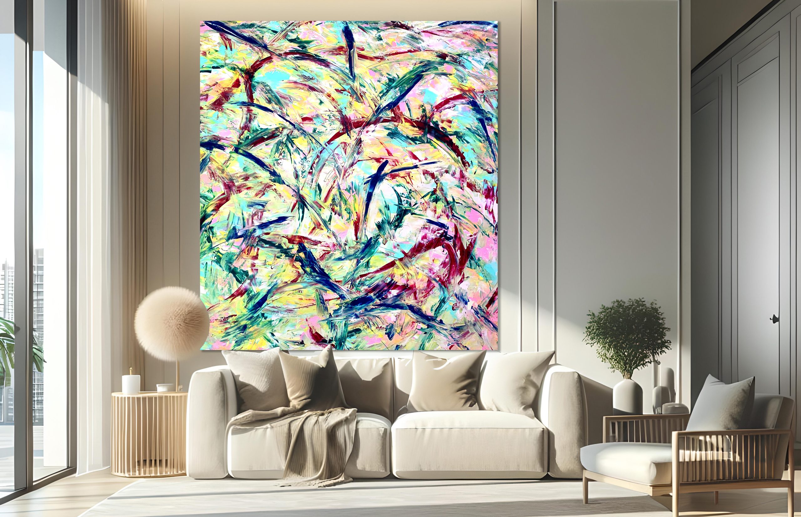This work is painted on professional-grade canvas and has been sealed with varnish. The canvas is 152 cm in width by 168 cm in height, and the sides are painted in the same style as the front.