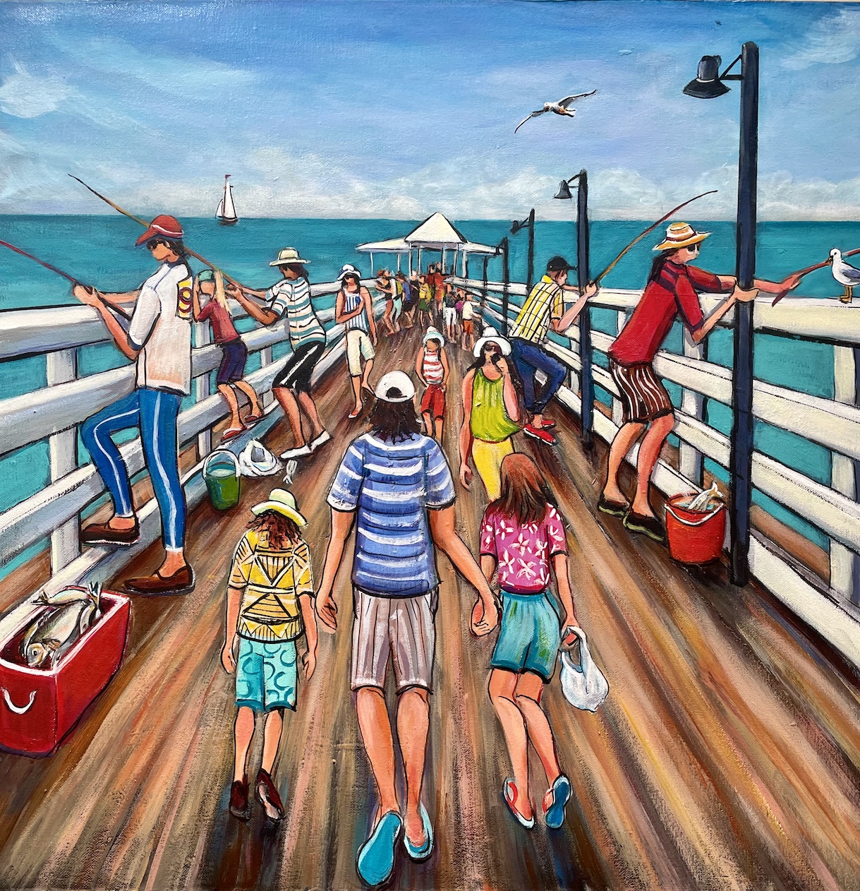 On the Bite by Sue Hill.  The inspiration for this jetty scene came after a walk on the Shorncliffe jetty.  Sue started this painting by initially painting the sea and sky and then worked on the jetty.  The people fishing or walking on the jetty are from her imagination and her intention was to portray a sunny optimistic day. She outlined forms in black to make them stand out from the background.