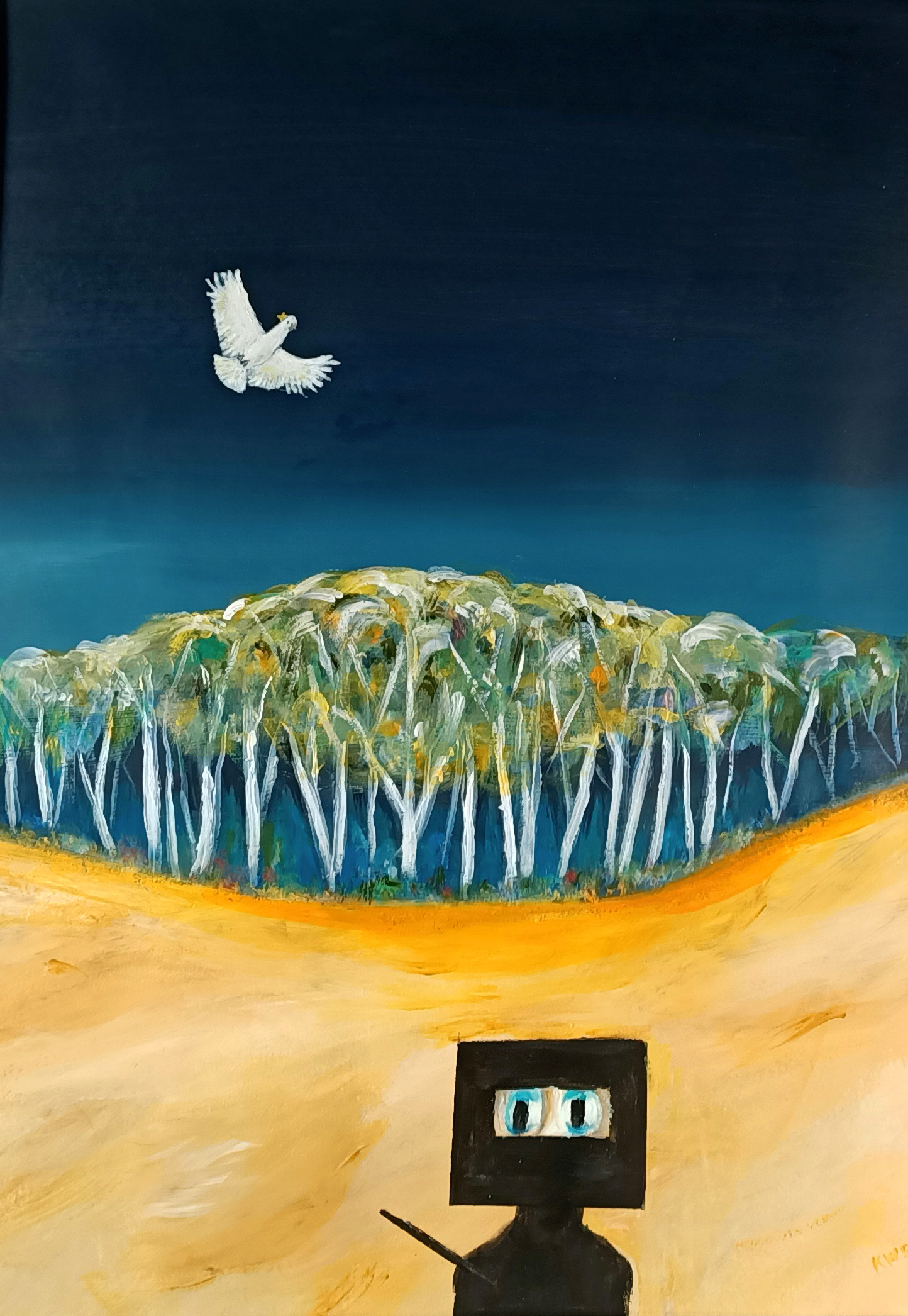 Inspired by the legend/myth of Ned Kelly and the works of Sydney Nolan. Ned is on the lookout as a cockatoo passes by.