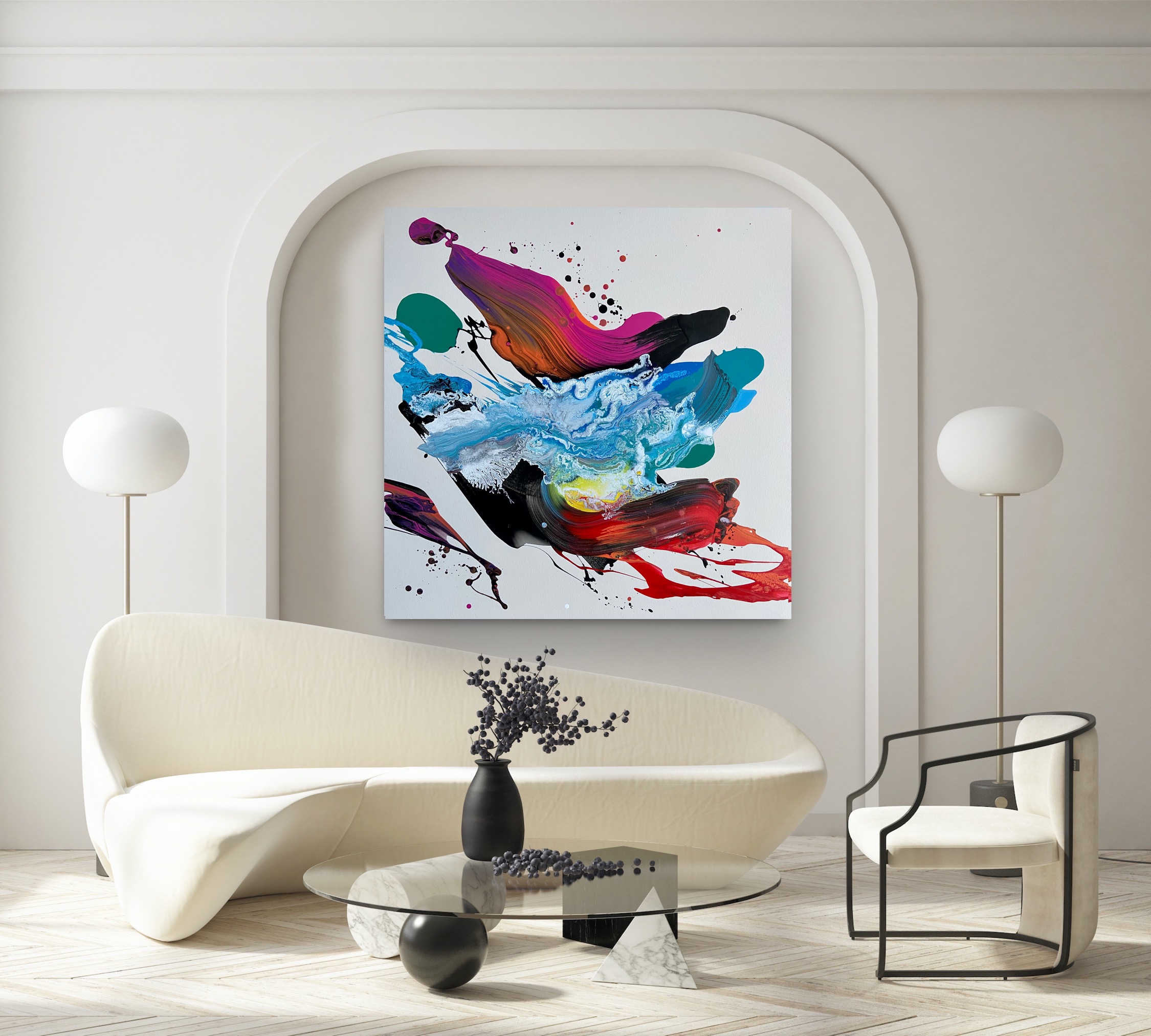 On the outside looking In by Jonathan Redmayne, a new painting that is carefully arranged by showcasing organic shapes that orchestrate a narrative of conflict and harmony, fragments of contrasting colours created through blending brushstrokes, abstract signatures and sculptural like curves. I strictly intend to offer a vision, a whirlwind of bits and pieces that altogether composes reality. Each and every time i change the narrative. A continued style from my latest series of work “narrative’s” for 2022