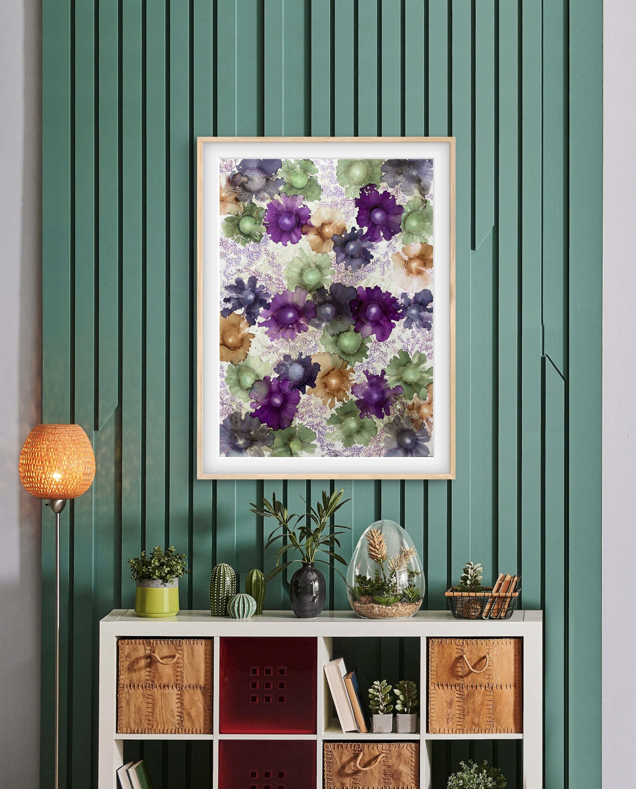 Original Alcohol ink on yupo paper sealed with high grade varnish and UV spray, framed in natural raw oak frame.