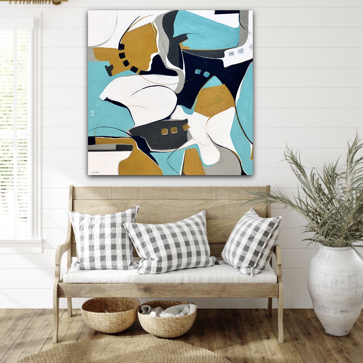 Using the colours of the ocean, the sea foam, salty wet sand and rock shapes, this is my interpretation of my many wonderful adventures down on the Salty Rocks. This piece of art has loads of texture mimicking the flowing water on the rocks and the wet sand giving extra visual stimulation and movement.