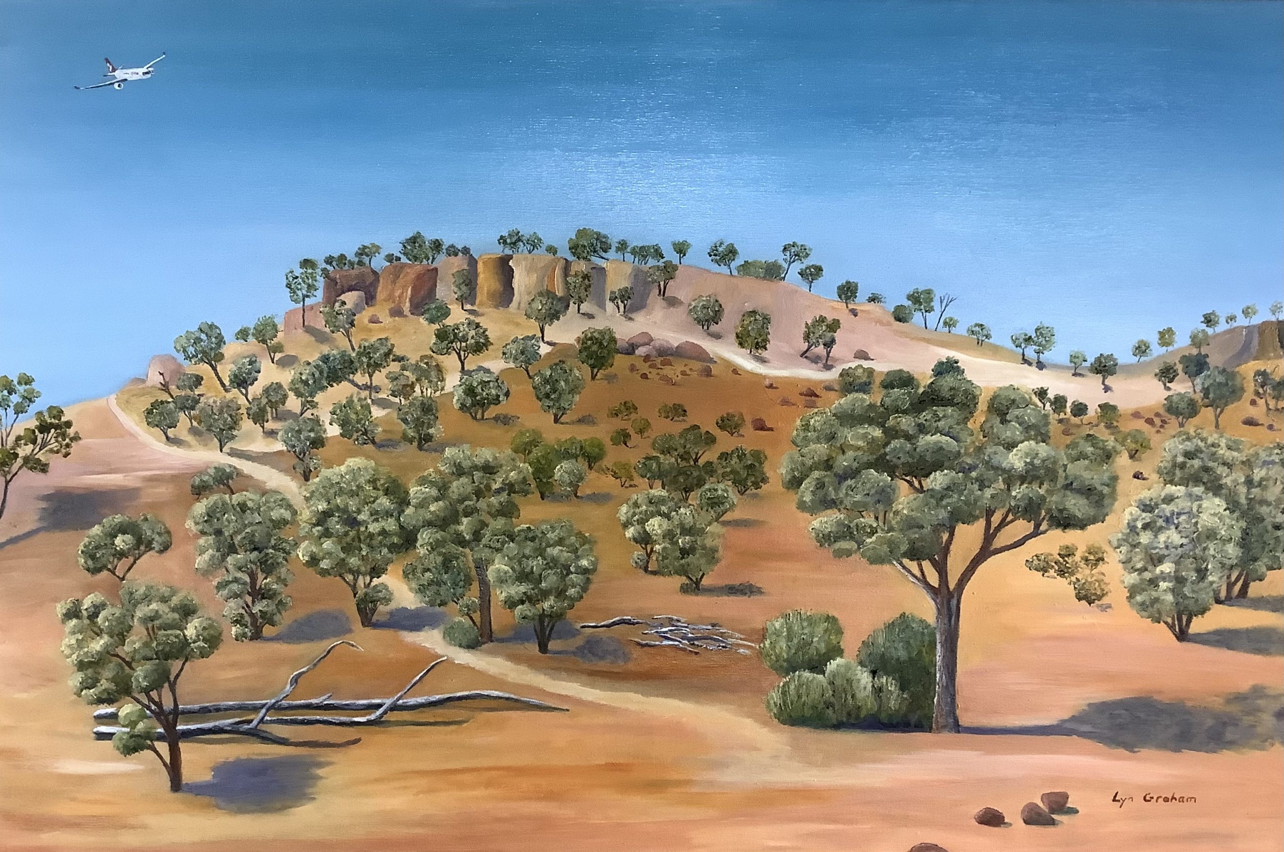 For many Australians, the outback is somewhere they fly over on their way overseas. They may look down and marvel at the vastness of the continent but they do not really see the ancient beauty below. ‘On the Way to Bali’ depicts a beautiful rocky bluff near Quilpie in western Queensland with a Qantas plane flying overhead.
