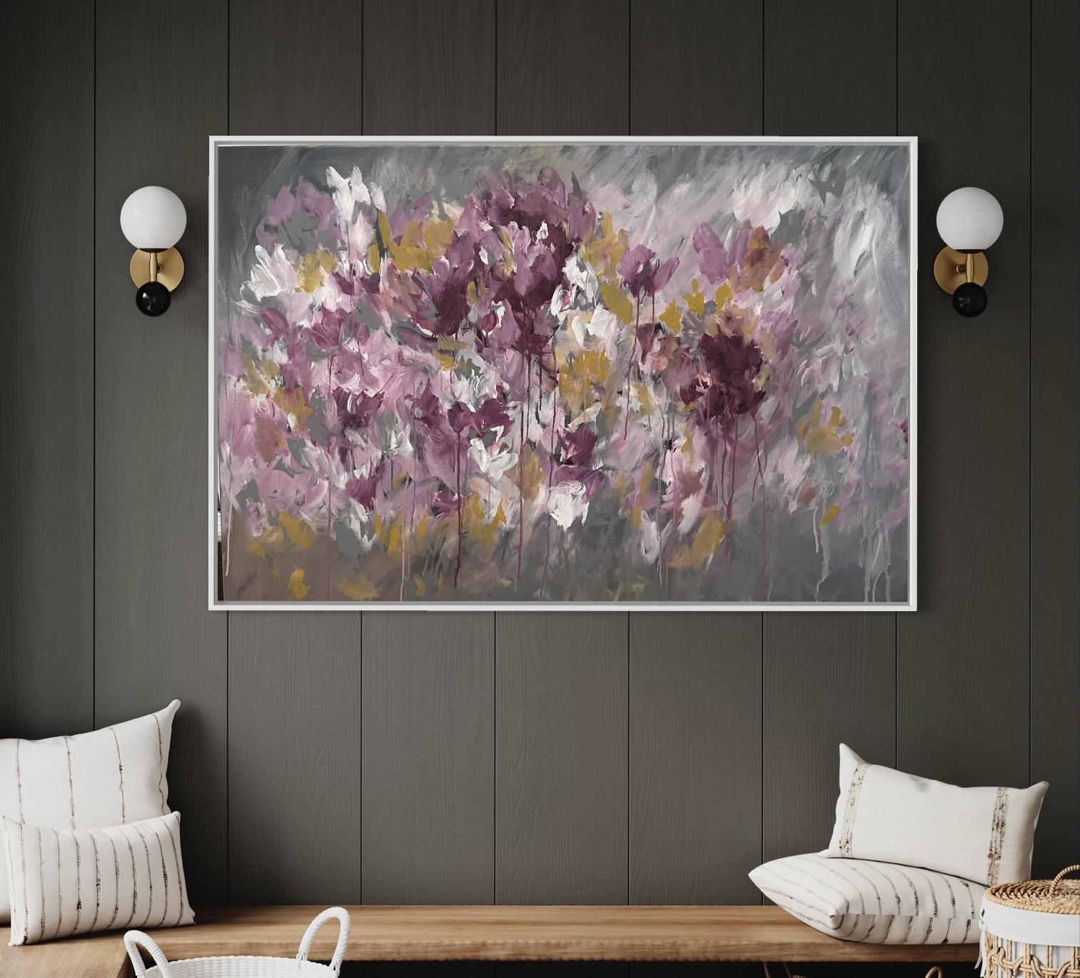 My abstract artworks especially with floral impressions from memory complete my creative journey, making it soulful and I believe that fulfilling experience can be felt in my works freely. I love painting with vibrant colors, using hands and loose strokes of brushes, palette knives and unusual tools of craft in the process of layer building. These play an amazing role in enhancing the depth of composition.