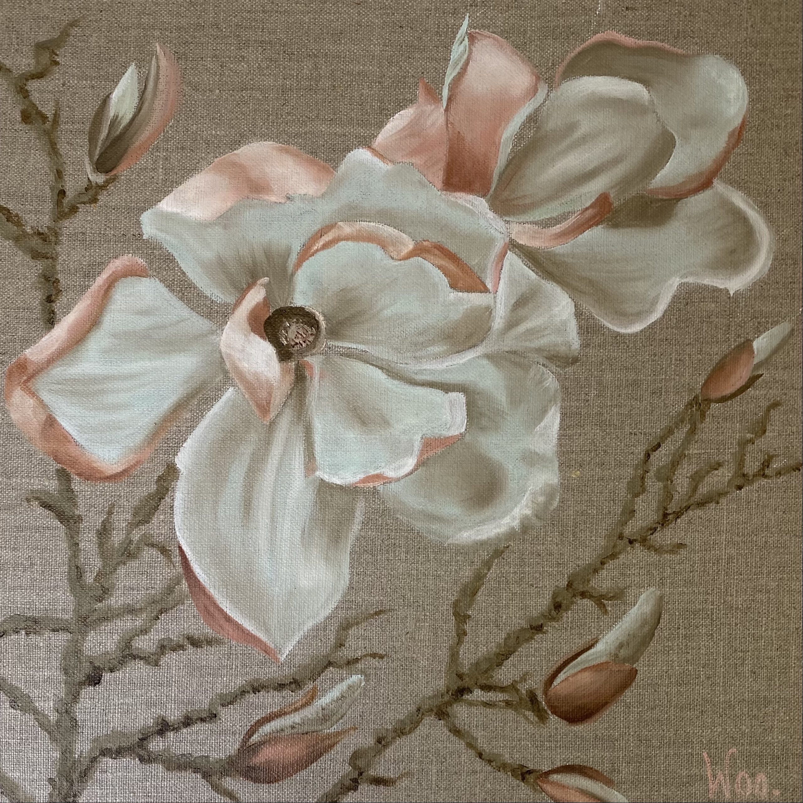 A friend has a line of magnificent Magnolia trees along her driveway, those incredible flowers have such a short life but when they are in bloom they are gorgeous. I just had to paint a series of small paintings to celebrate their fleeting moments. I used Duck egg blue paint as it happens to be one of my favourite colours. These would look great as a pair in a bedroom, unframed or in a lovely Tasmanian oak frame.