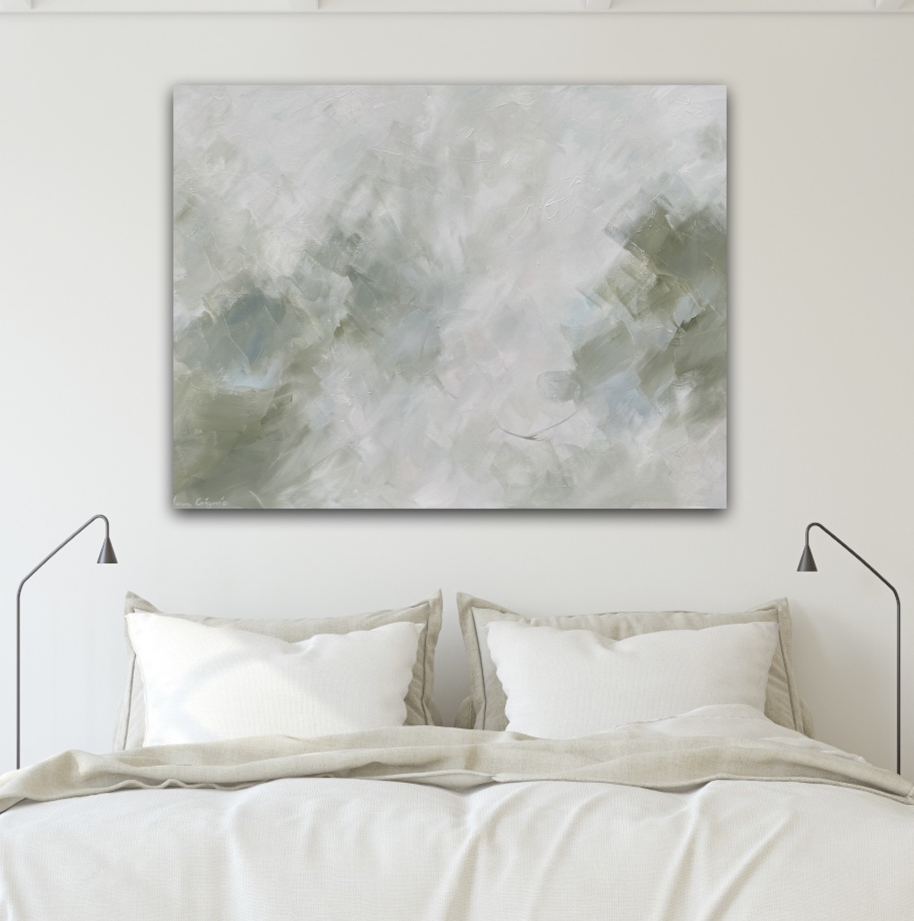 These soft olive green and white tones create a soft, dreamy atmosphere. The colours and soft and calming that gives the piece a tranquil, almost meditative quality.