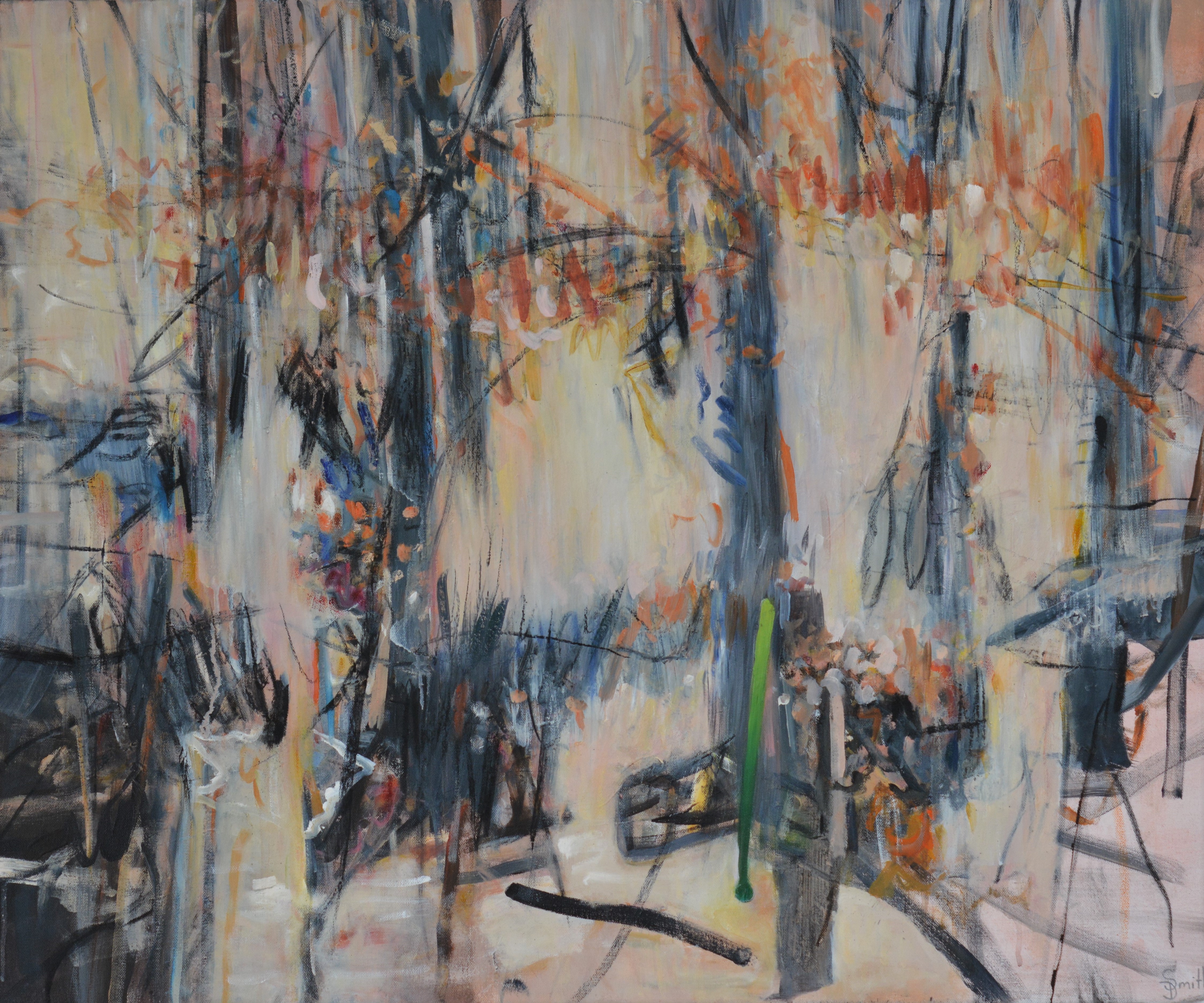 ‘One Green Shoot’ is inspired by the stillness and calm in the bush after the recent fires. Walking through the tangle of twisted branches, blackened trees and burnt leaves a mass of rhythmic lines, shapes and intense colours emerged. I was drawn to one green shoot contrasting with the orange black and grey tones of the foliage. The single green shoot a symbol of fragility and renewal. I picked up burnt sticks and used them to draw back into my painting.