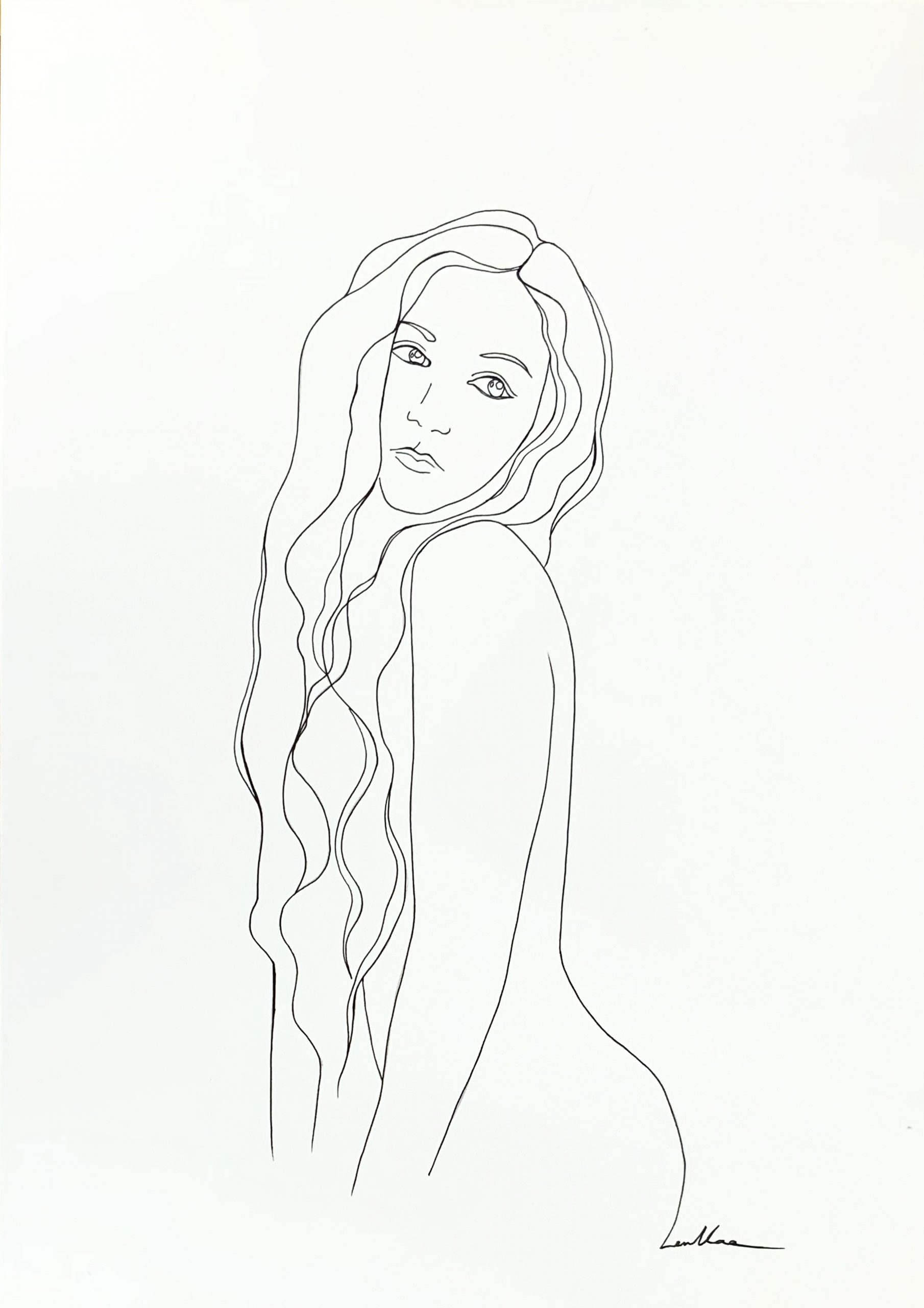 An A2 original line art drawing by Sydney artist Leni Kae, of a nude looking over her shoulder. From the series “Lines”, the artist uses the line work to explore an appreciation of life’s simple moments of joy, love, and new beginnings. A2 sized artwork on paper (42 x 59.4cm, approx 240gsm)