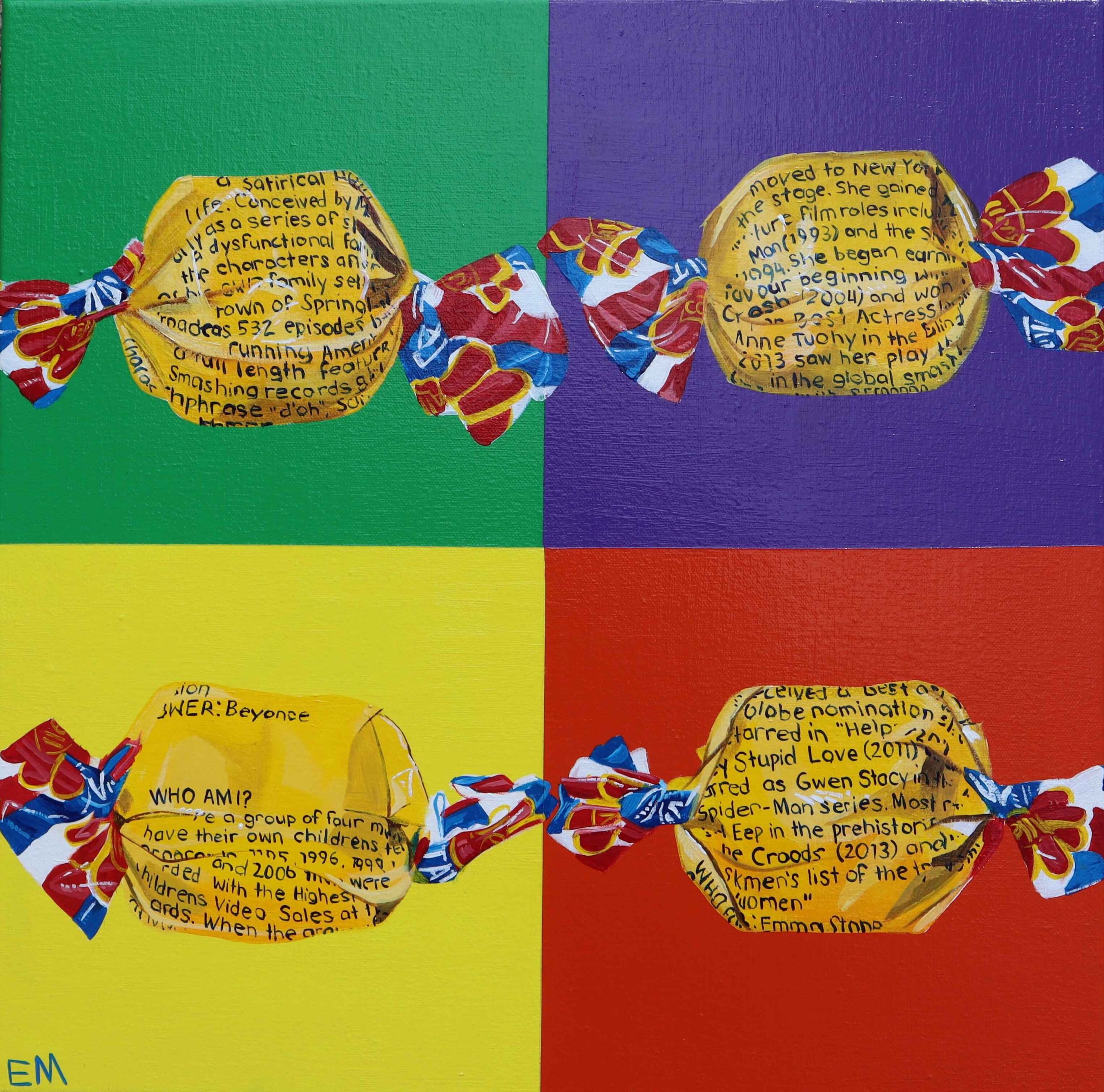 This pop artwork is inspired by the delicious treat, to the time spent with families and friends playing ‘who am i?’ as you worked your way through a packet of chewy caramel covered in chocolate.