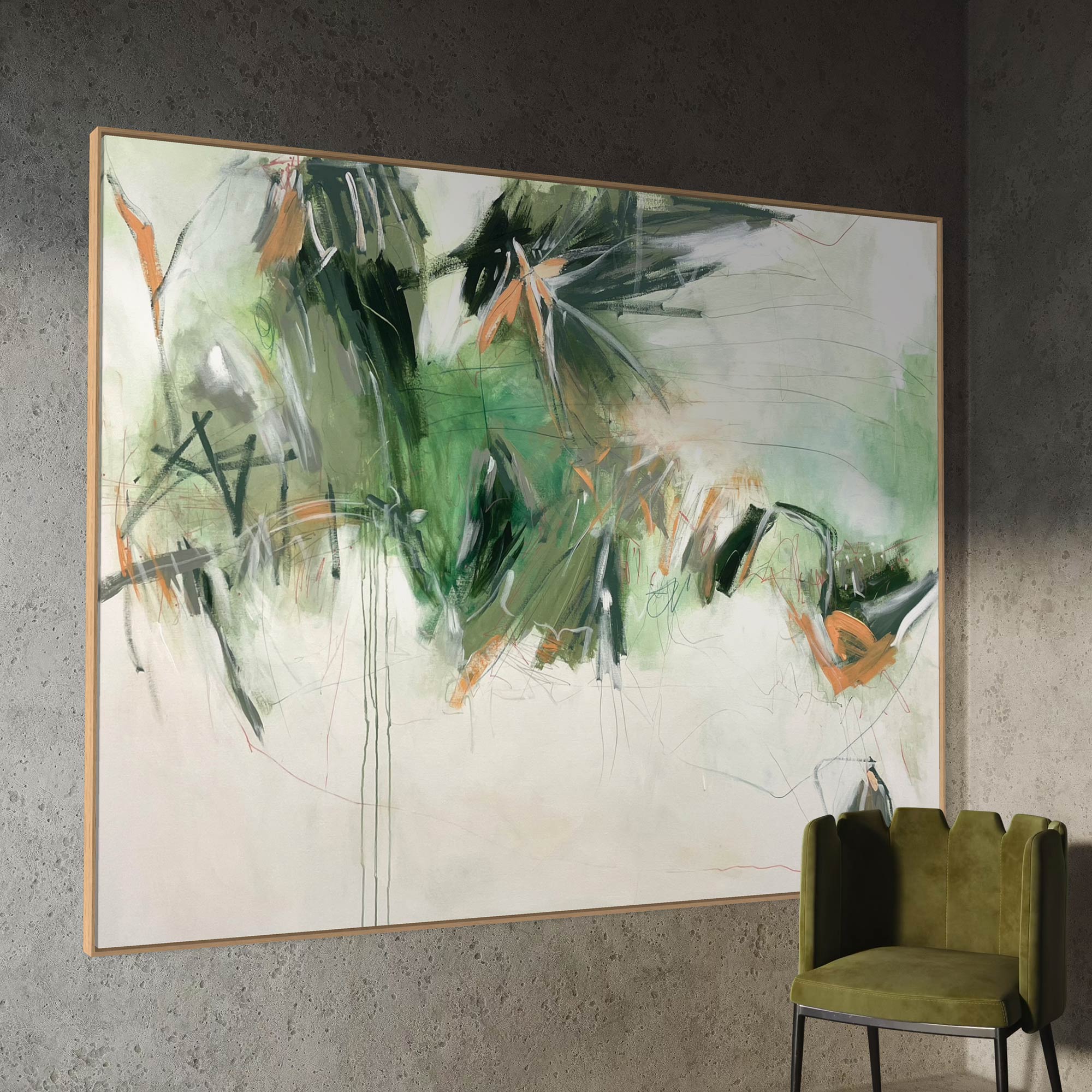 This stunning piece is an original framed statement painting, combines complex mark making and texture with a beautifully balanced palette of white mixed with areas of beige, light green, grey, dark green and olive with pops of coral.