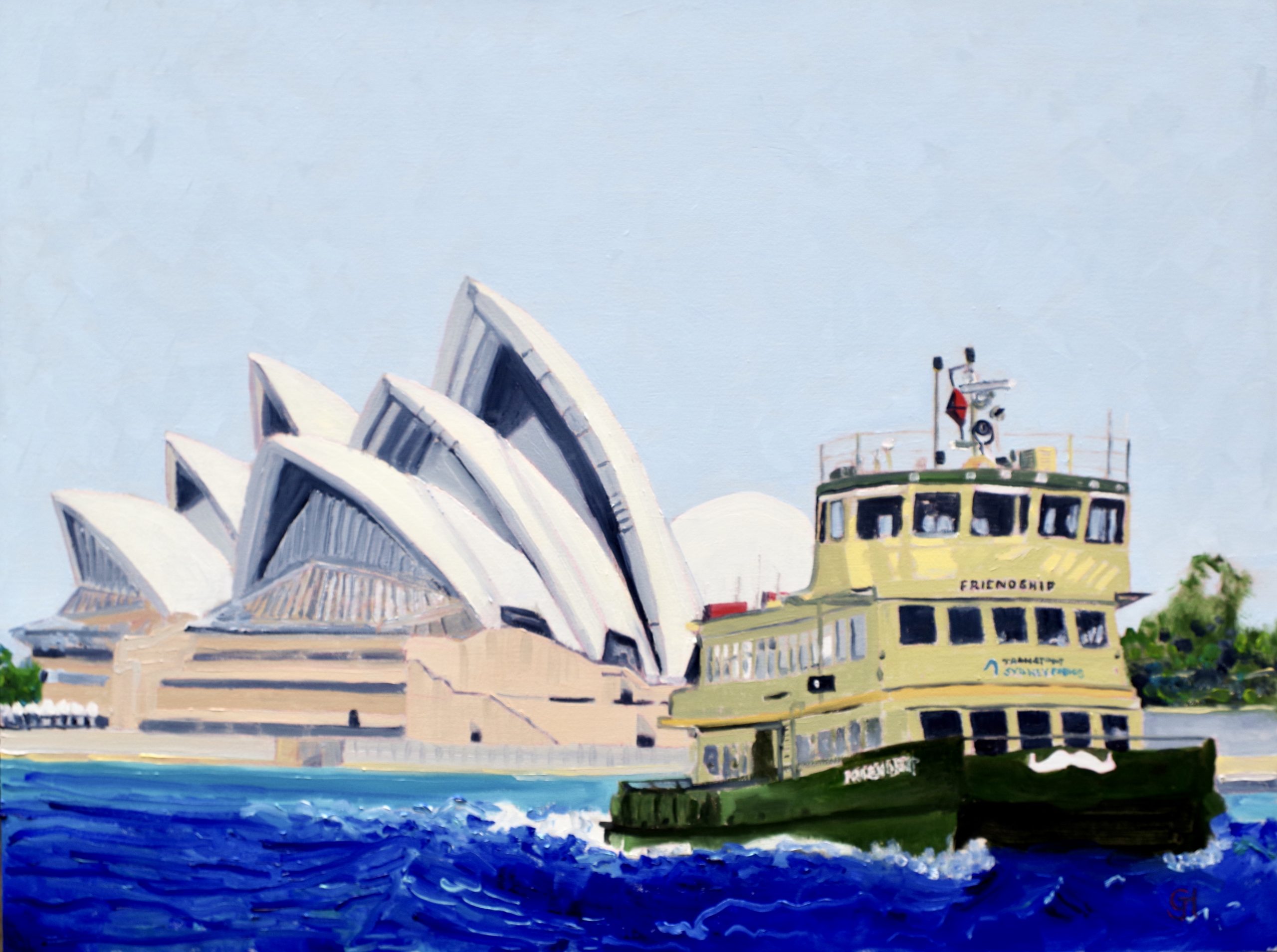 Opera House Friendship by Geoff Hargraves – The Opera House, Sydney Harbour and a Sydney Ferry. The ferry Friendship is heading out from Circular Quay to take passengers home, to work, or maybe just to see the sights. Sydney on a beautiful sunny day, with a glimpse of the Royal Botanical garden behind the Opera House.. sides painted black, wire across the back, ready to hang. A view of Sydney Harbour.