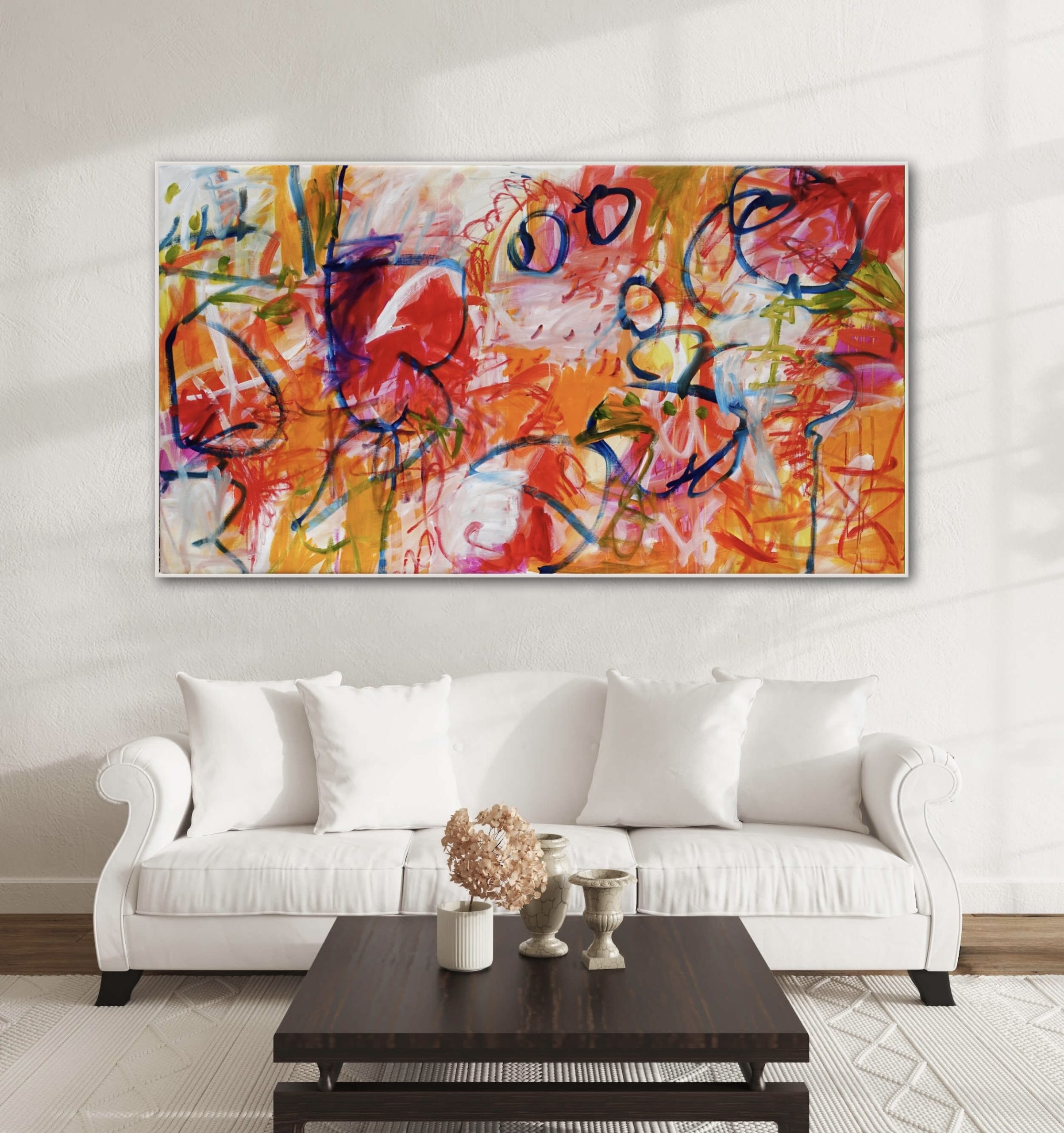 The painting is painted on the sides so if hung stretched without an exterior frame it will still look lovely from any angle (no ugly white sides). I actually hang all large works in my house without exterior frames because I feel that allows the paintings to continue beyond its borders. But this is just my personal preference so I have included images with frames to show you what the work will look like framed.