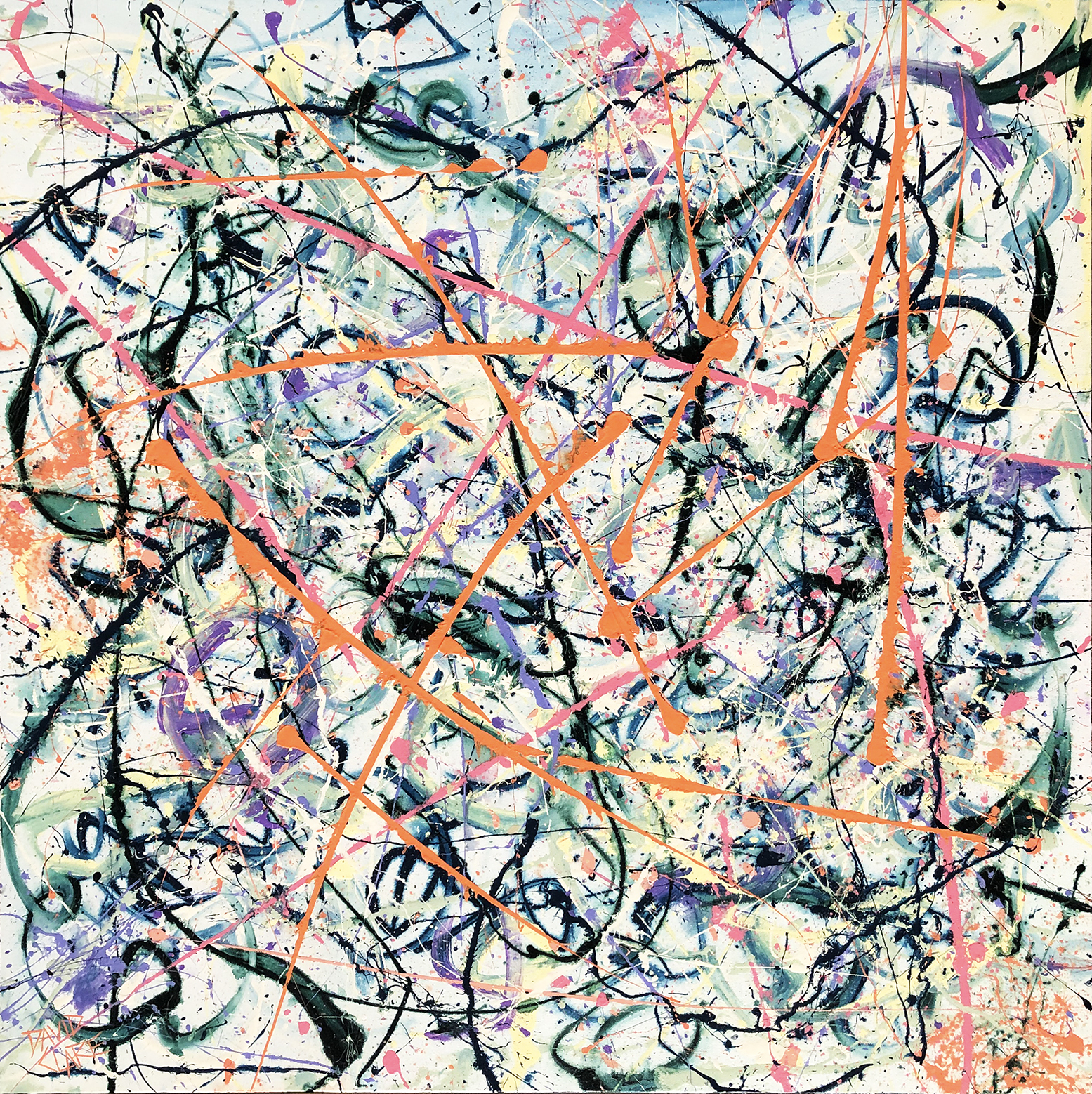 Orange Poles by David Clare – Influenced by paint and colour. I just love the way paint interacts with itself, and colours mix and sit against each other. Completely random, yet somewhat calculated. I was careful not to overwork this one. Original abstract painting using splashes of paint. On thick stretched canvas, ready to hang.