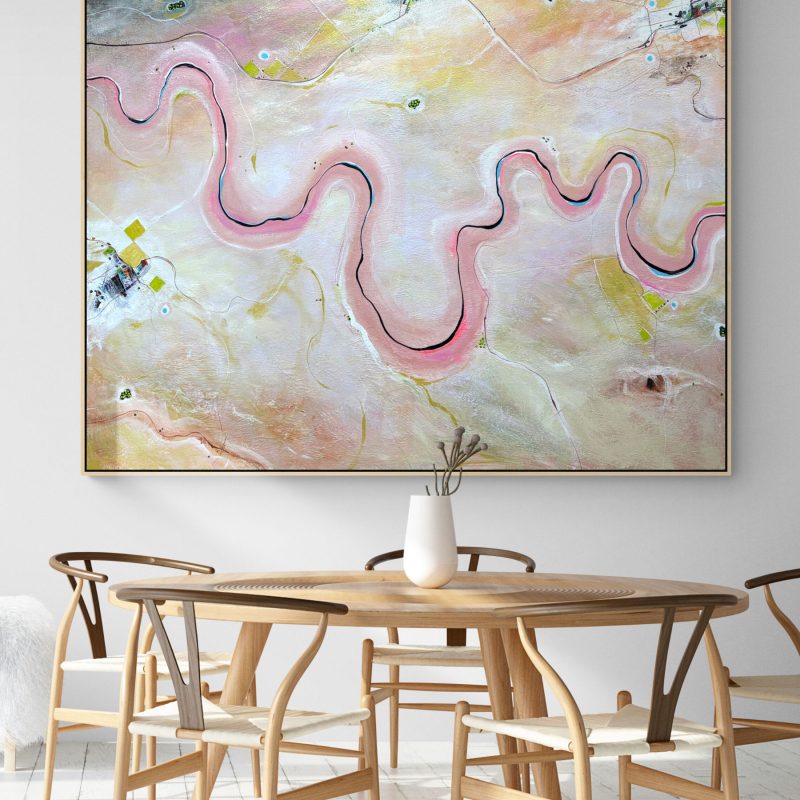 The artwork is mixed media paint on canvas which has been painted black around the edges and is ready to hang.