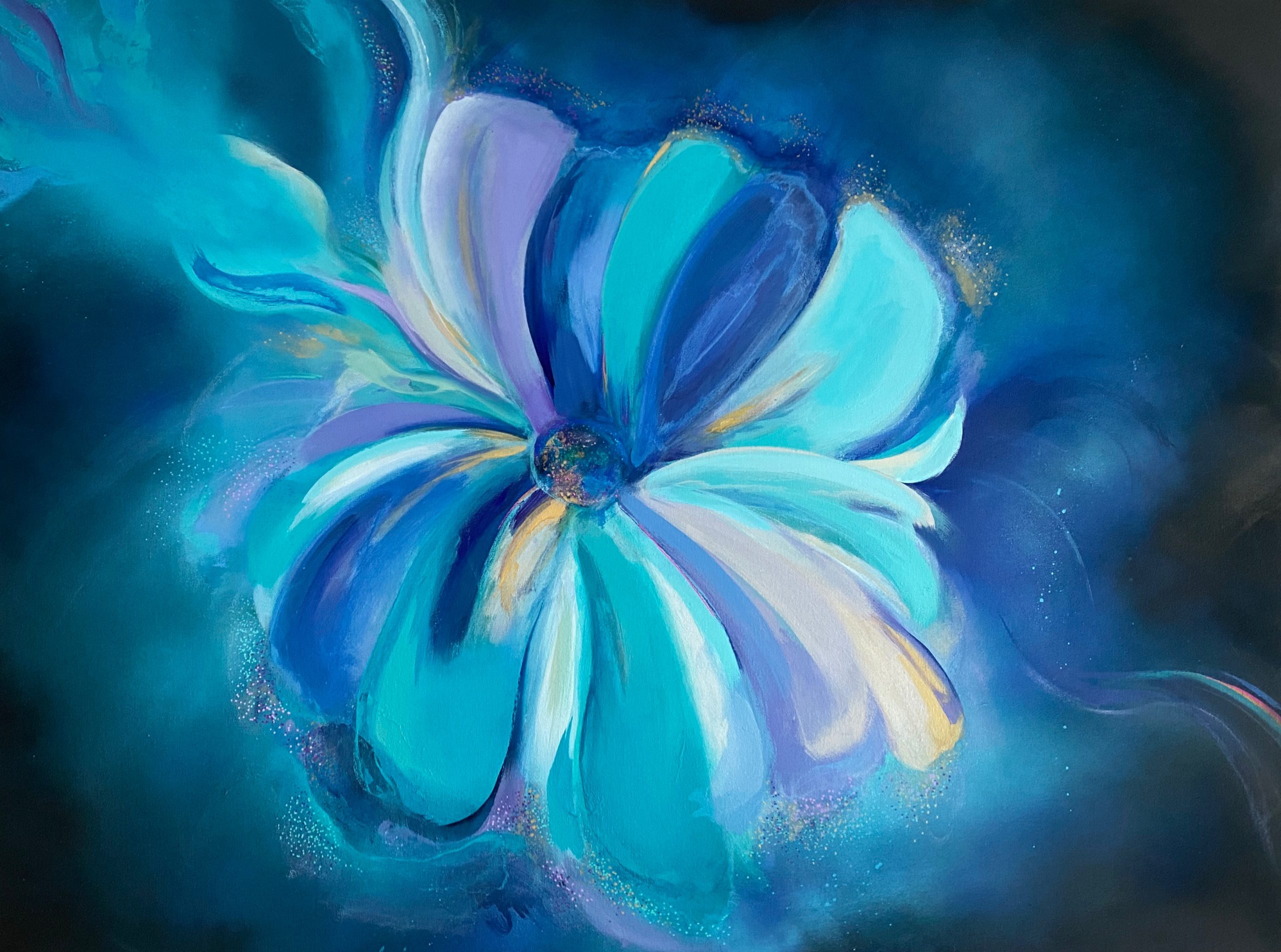 A contemporary piece of art with vivid hues of turquoise, hints of regal purple, shimmering gold and tranquil blues.