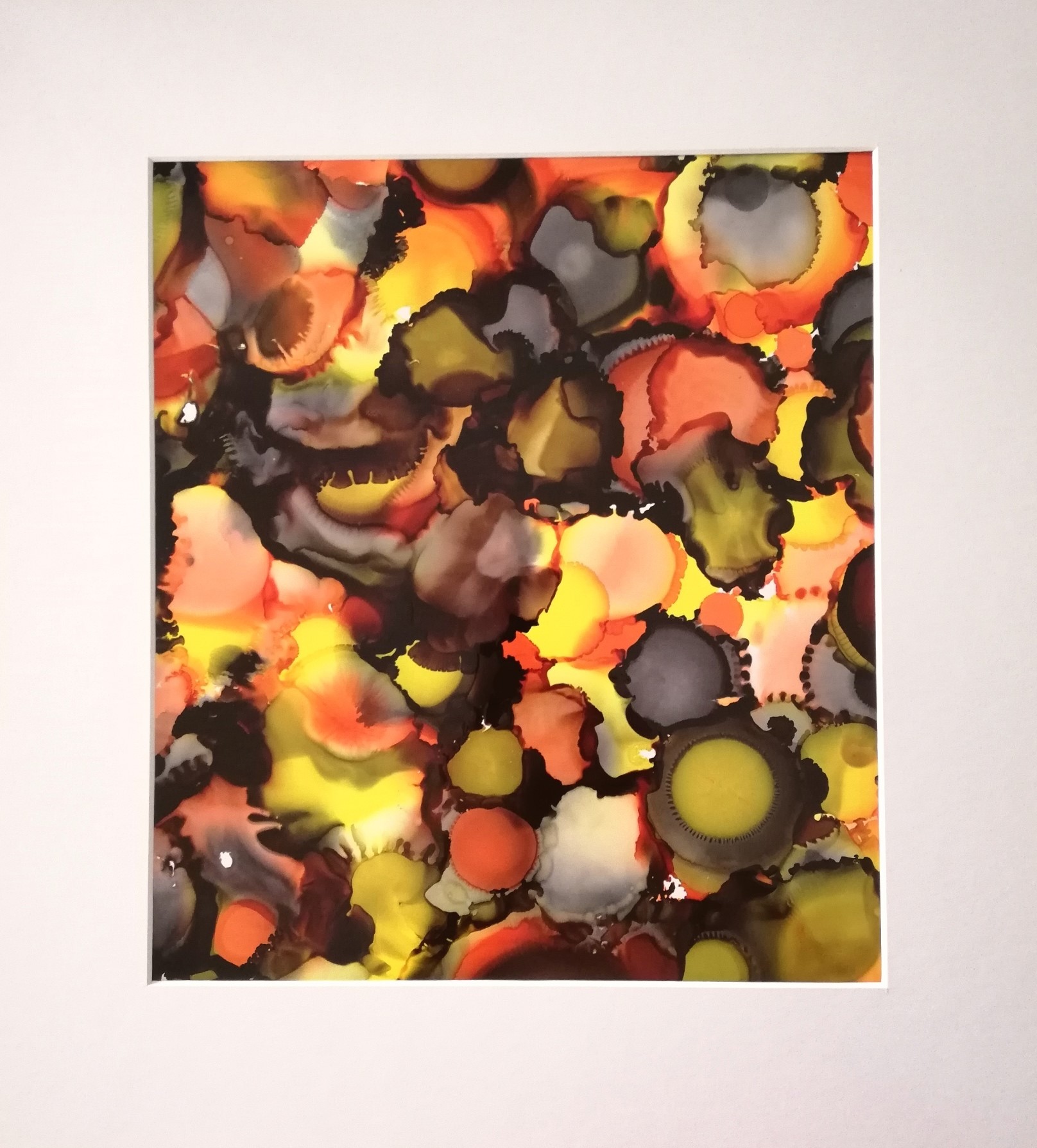 Organic Life 2 by Cathy Gilday – This vibrant artwork has a wonderful organic feel about it. It is quite spontaneous and has some very curious shapes, some that look very much like fruit! It has a white mount , 37.6cmx 41.7cm, total outside measurements. I have purposely left the piece unframed, as it can be hung in either portrait or landscape position. Alcohol ink on Yupo paper.