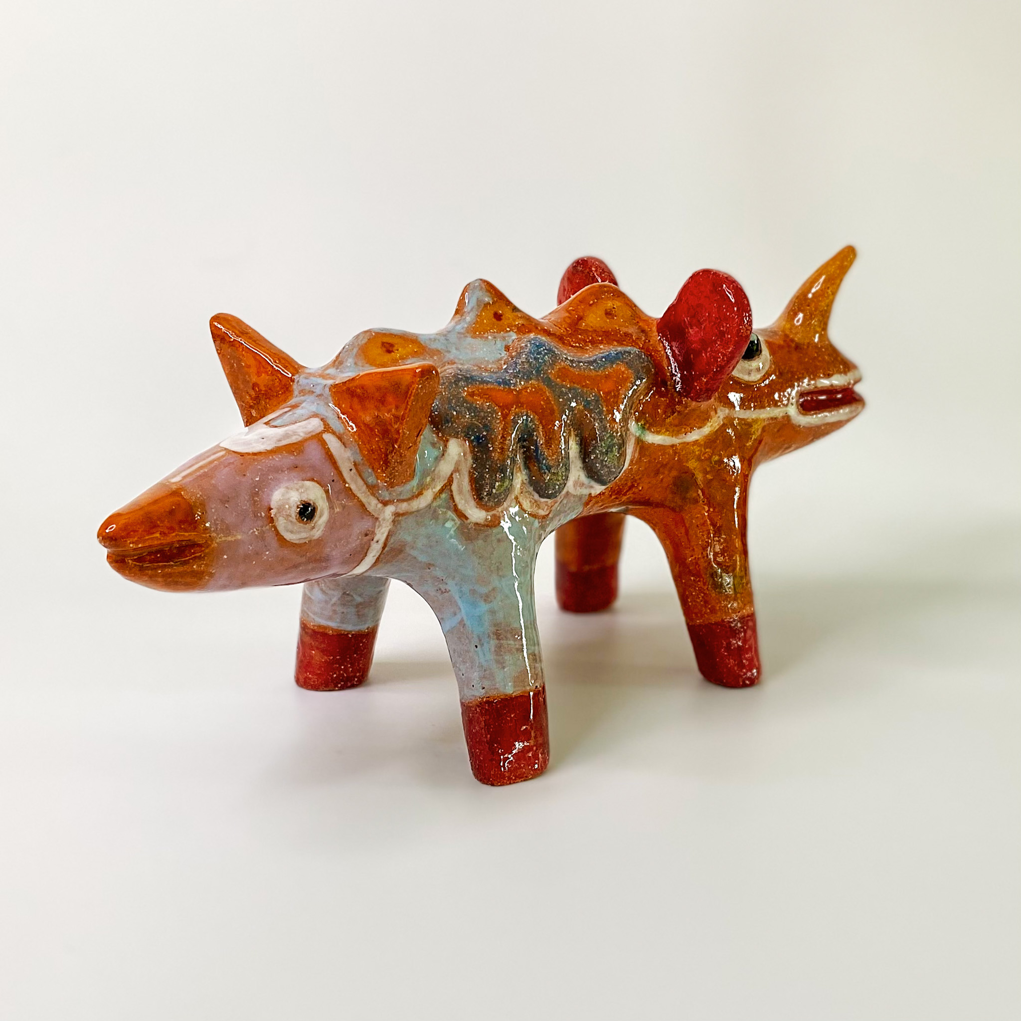 Double-headed mythological dingo. Raku clay, multi-glazed.