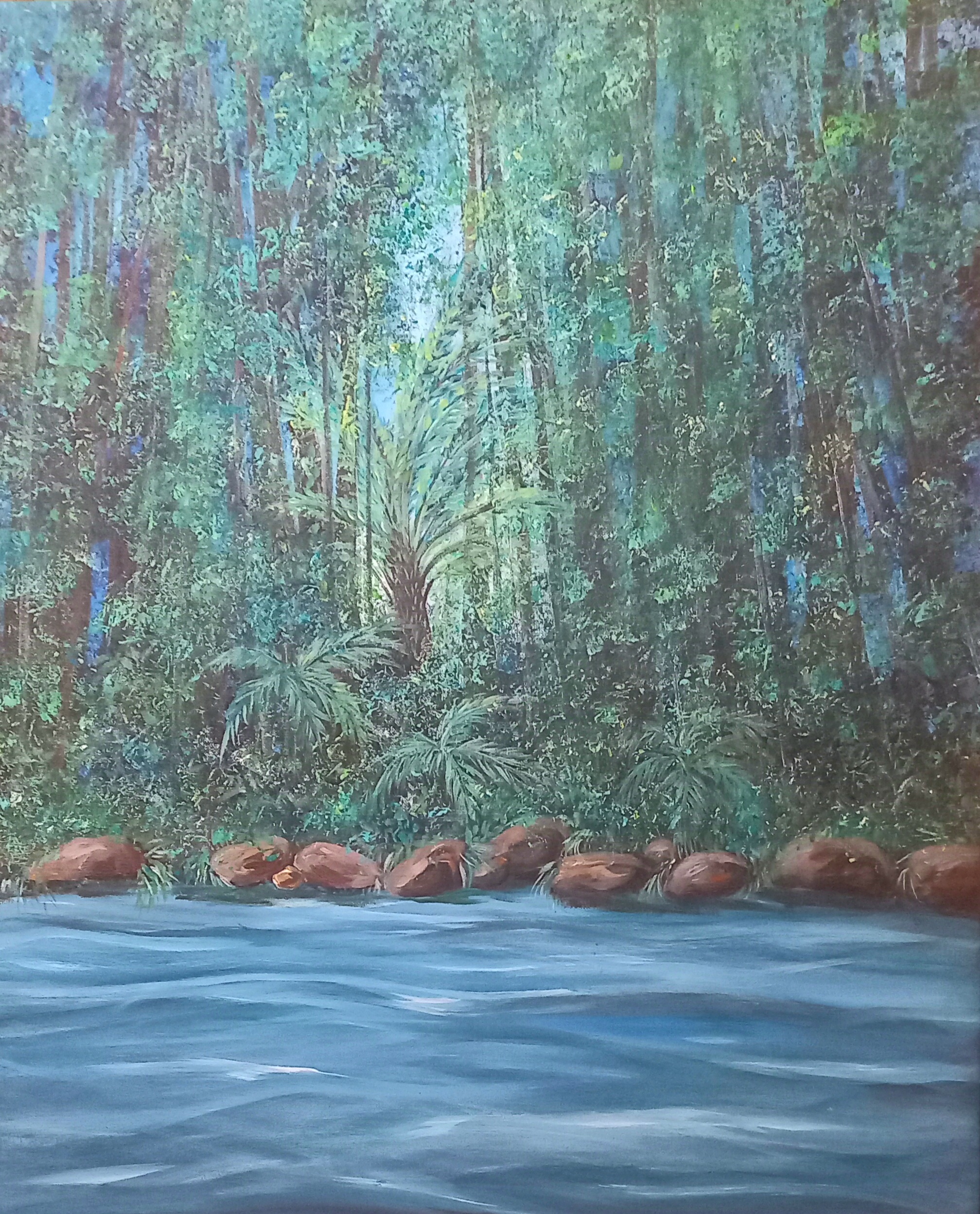 Otways and River by Marion Smith – This original realistic landscape painting of the towering trees and ferns found in the Otways rainforest of Victoria are depicted next to a flowing river. The cool greens and blues used in this painting create a peaceful, calm, natural atmosphere. The painting is created with layered acrylic paints on stretched canvas and is ready to hang.