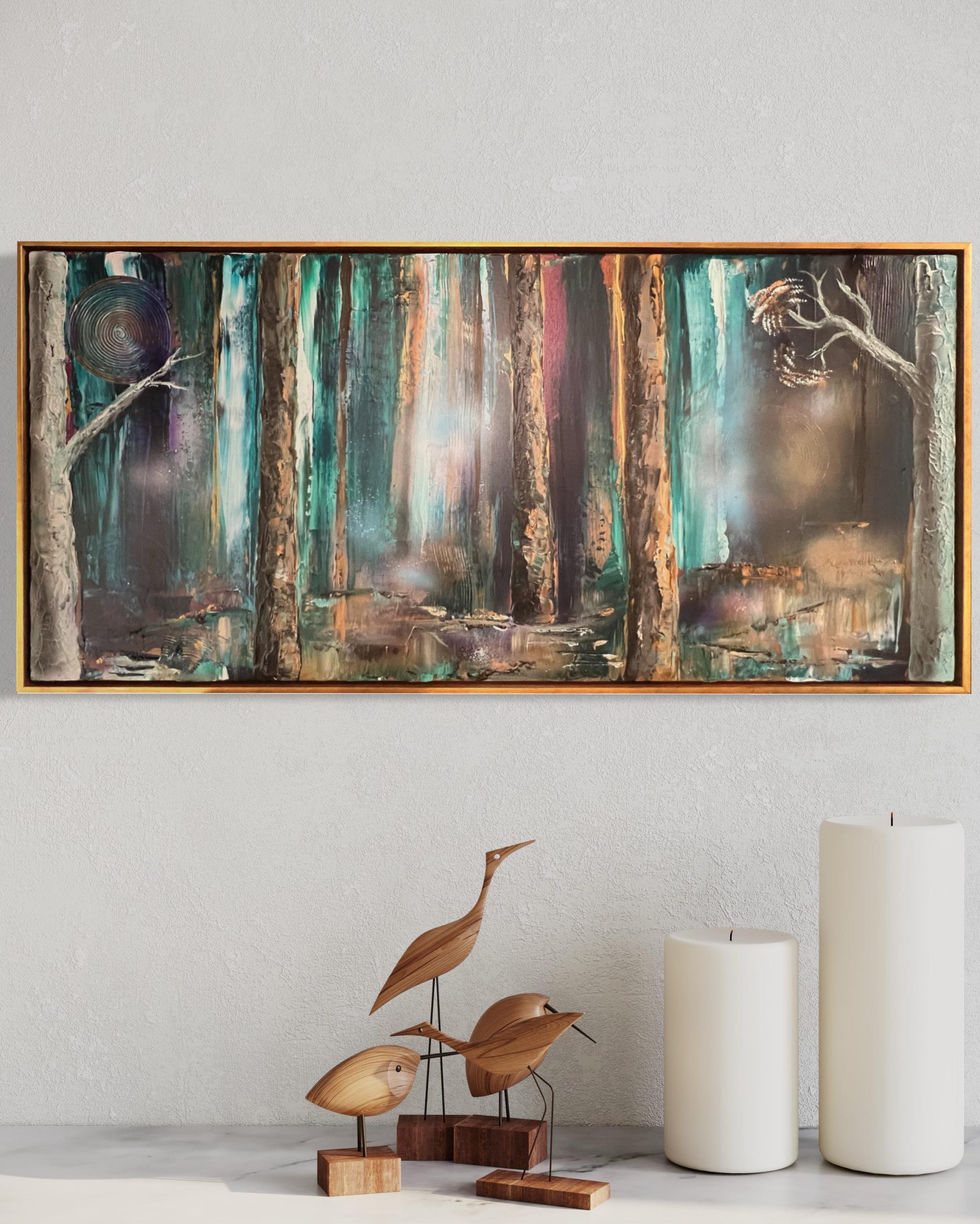 After the long summer the first rain on the forest was something magical, energetic and joyful. You could feel a relief from the forest. This painting is loosely painted with deep texture and beautiful metallic pigments.