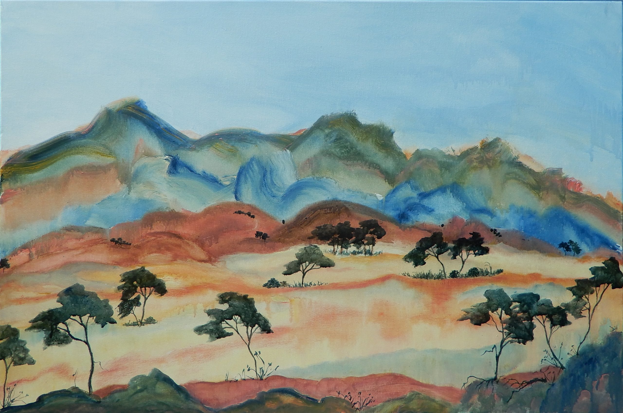 I’ve used a photo taken by a friend in the Flinders Ranges as inspiration for several paintings. I explored the rhythms in the landscape for this version and abstracted colour and form