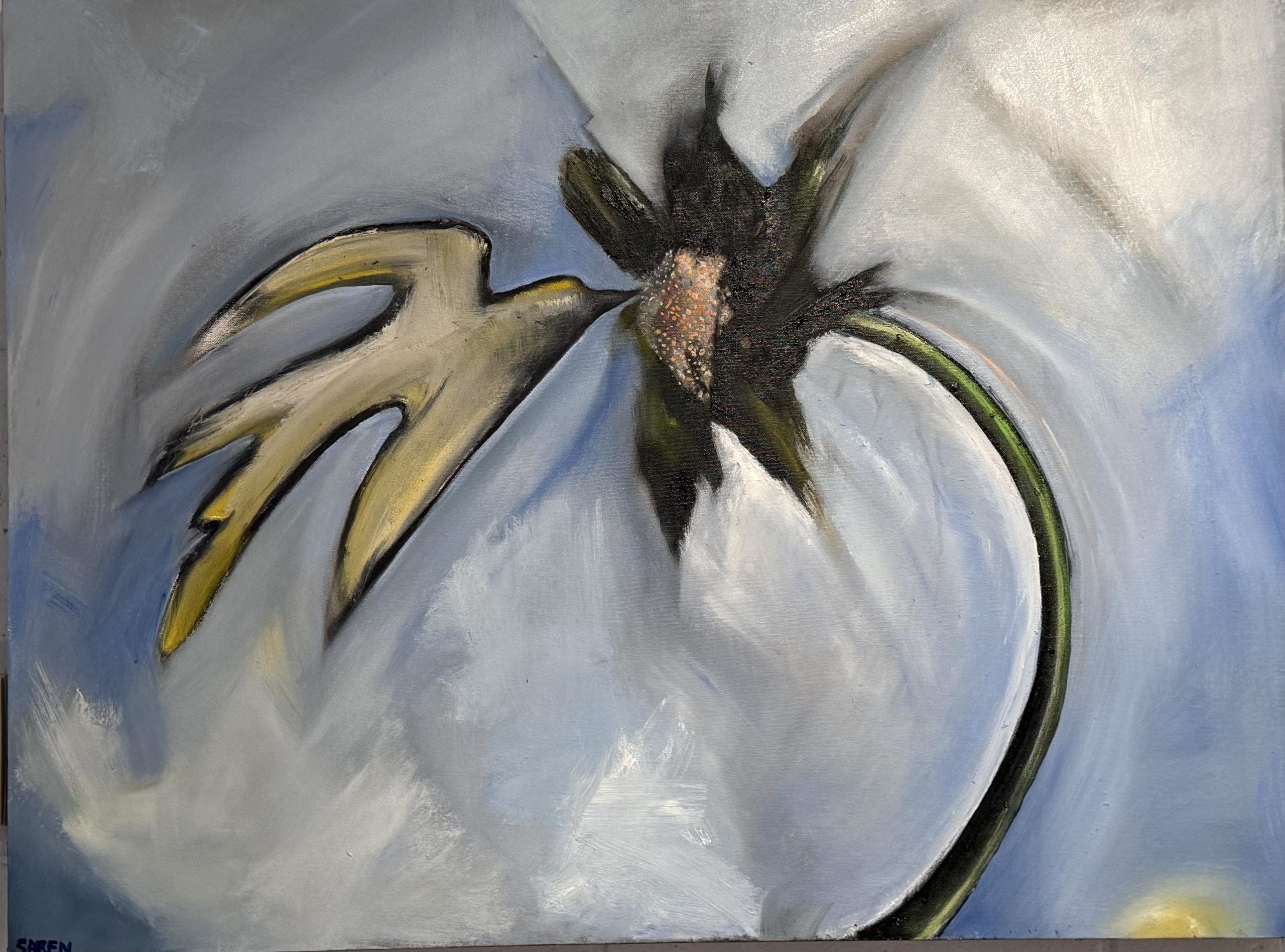 Out of The Blue by Saren Dobkins – This piece presents a flower in a moment of transformation, its petals stretching outward as if reaching for something beyond the canvas. The swirling background evokes a sense of fluidity, mirroring the complexities of growth and change. Each brushwork reveals layers of emotion, inviting contemplation on the interplay between beauty and vulnerability. A striking addition to any space, it encourages reflection on the journey from formlessness to form.