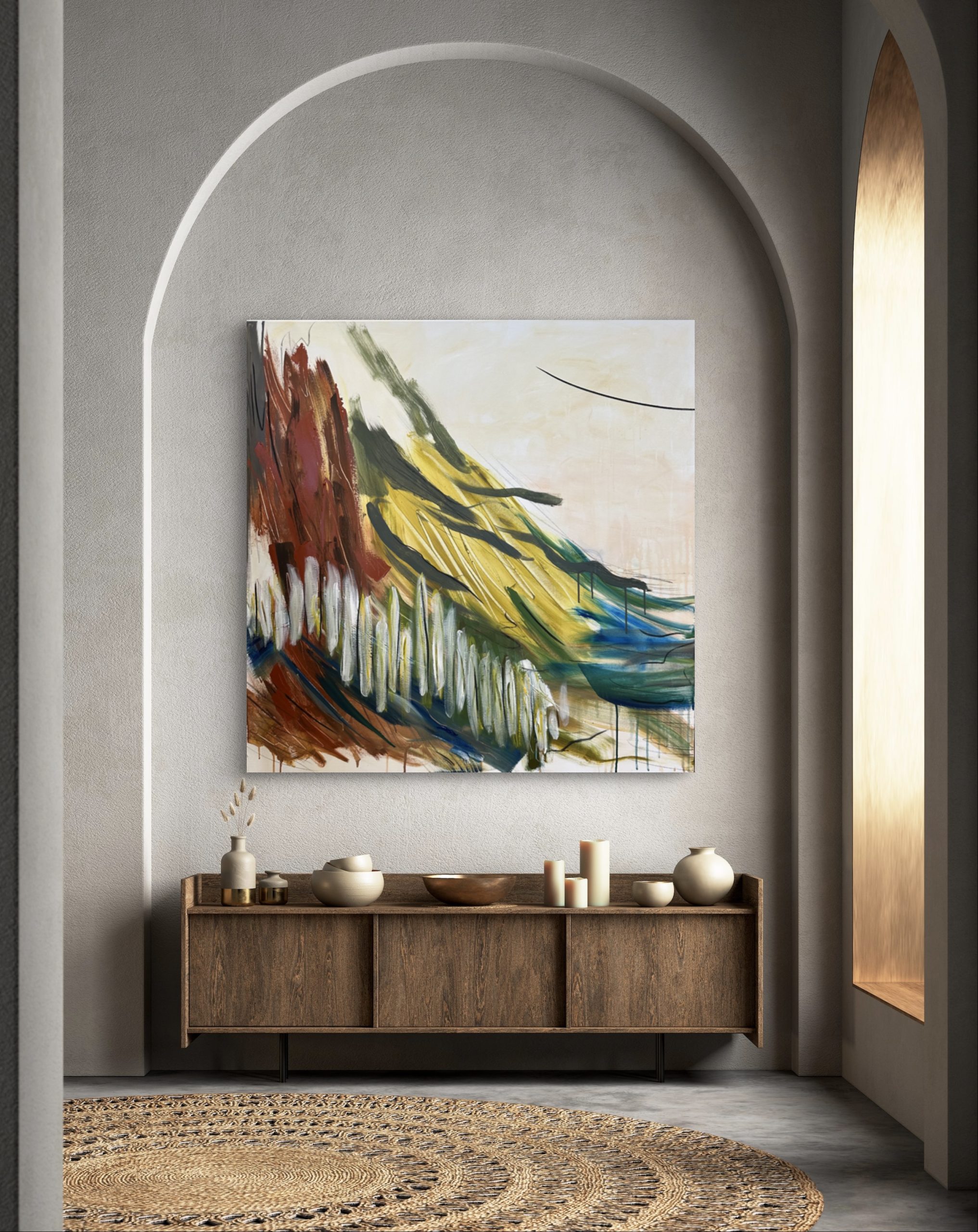 This artwork has lush strokes in shades of beautiful olives and greens, and earthy reds and browns. It’s reminiscent of a relaxing walk among the woods.
