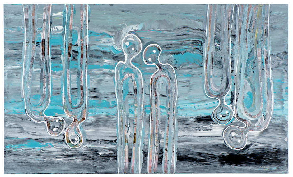 More recently, Omeenyo has been living and working in Cairns as well as completing private and corporate commissions in Brisbane studios. Her paintings continue to reflect both traditional stories and contemporary themes associated with cultural, social and environmental concerns. The artists figurative compositions represent blood line, which connects ancestral spirits with kin relationships amidst coastal beach and reef imagery. Through supernatural manner, ancestors exist simultaneously with the present-day generation.