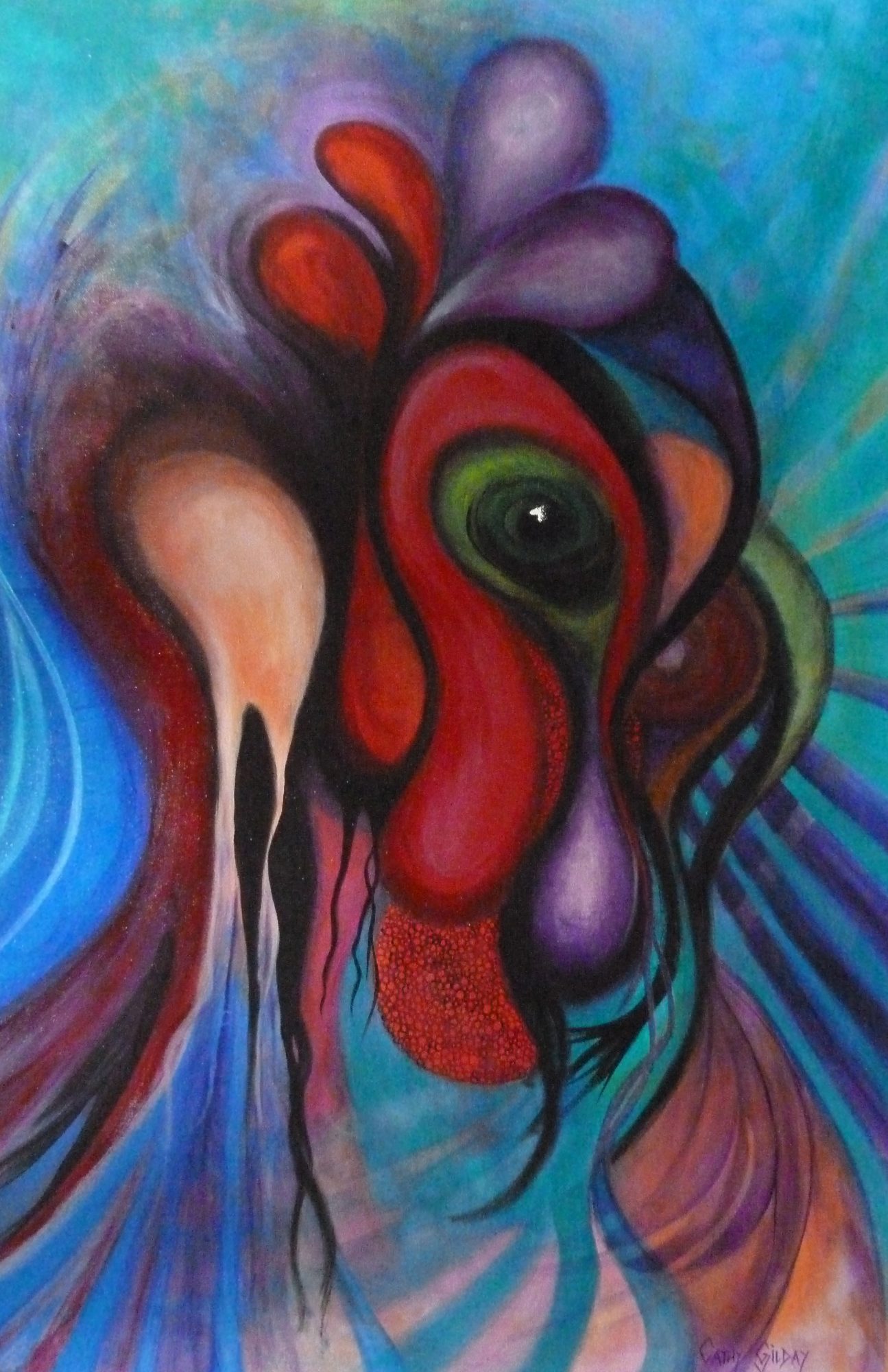 Out There by Cathy Gilday – “Out There‚” belongs to a series I did, where I began with charcoal and then contaminated with acrylic paint. This allowed me to form tonal shapes with a naturally rhythmical flow. It evolved into this colourful & playful painting with a turkey-like resemblance. It has an organic‚ free flowing feel about it. The work is sealed and ready to hang.