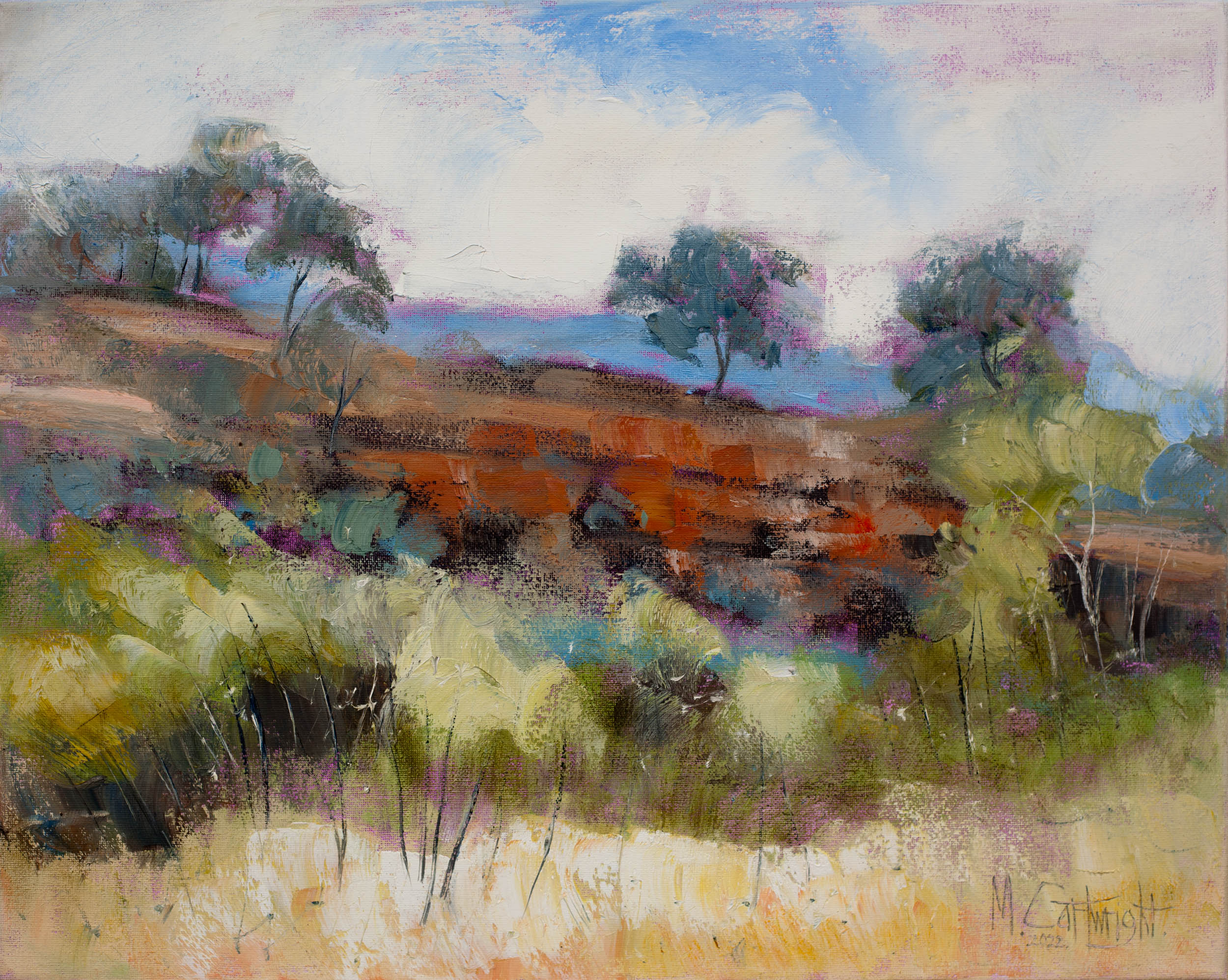 A semi abstract impression of our great Australian Outback. Rendered with thick textured strokes using a palette knife. Spontaneously painted in alla prima style using artist quality oil paint.