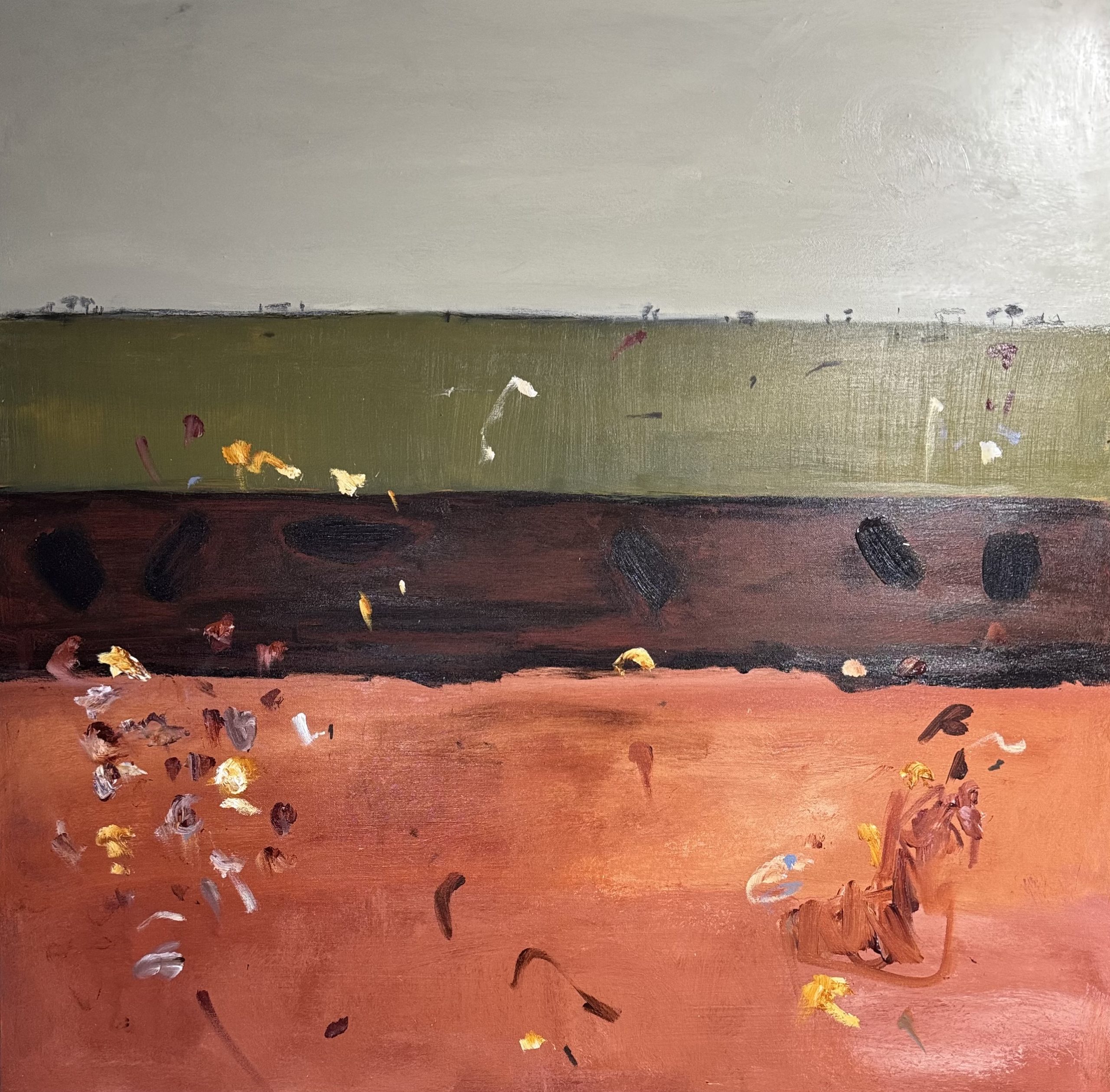 Across these bands, I’ve added my signature marks—small flecks of yellow, white, rust, and grey that feel like scrub, flashes of light, or moments carried by the wind. These little gestures break up the structure and bring movement into the scene, offering glimpses of the life and texture that exist within the vastness.