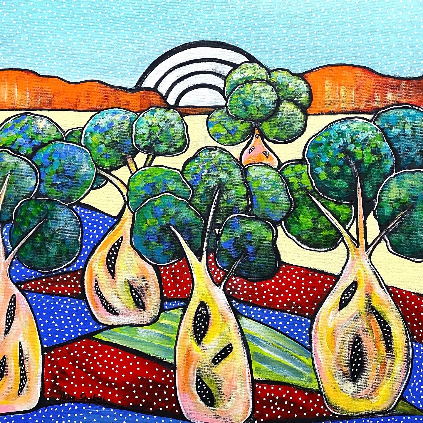 A lovely sized artwork for a special room at home. Inspired by travels to Mitchell, Queensland, where bottle trees line the Main Street and the odd emu or two can be seen running beside the road. A fun, energetic, unique landscape where trees live for 150 years and the country colours glow all year around.