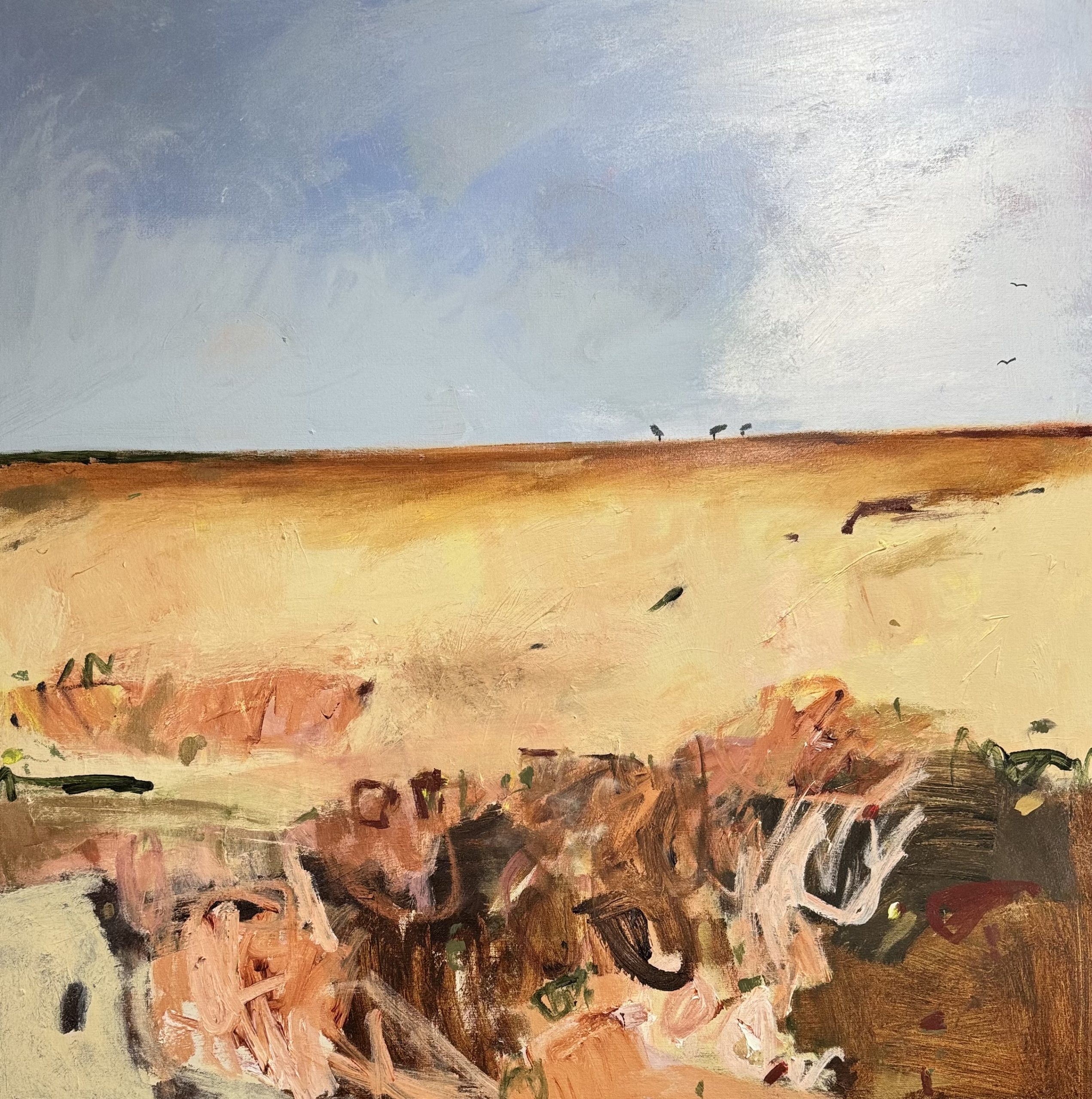 In the foreground, rich earthy tones of rust, sienna, and deep browns with small pops of bronze and gold are built up through expressive brushstrokes and textured mark-making. These layered marks suggest ancient land, shaped by time, heat, and history. The painting captures not just the colours of the outback, but its spirit — resilient, raw, and quietly powerful — inviting the viewer to pause and feel the timeless beauty of the Australian landscape.